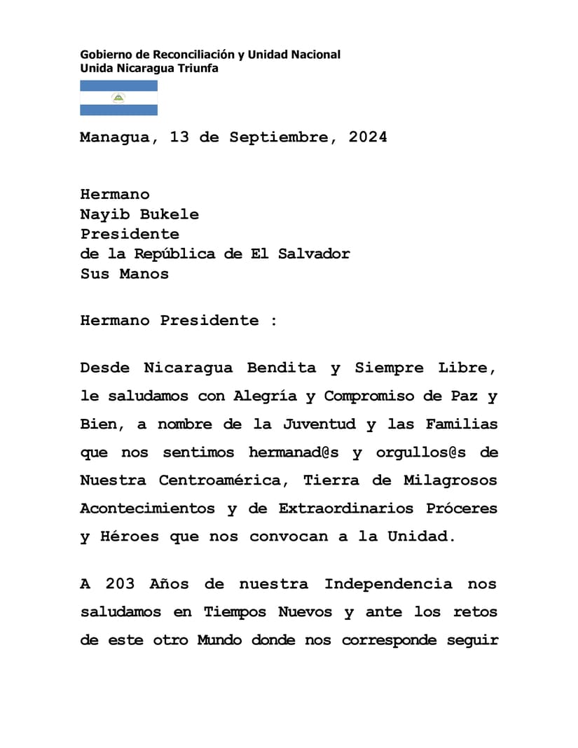 Saludo Fraternal de nuestro Pueblo y Gobierno, y de la Presidencia de la República, a los Hermanos Presidentes de Guatemala, El Salvador, Honduras, y Costa Rica, compartiendo los Festejos de la Independencia de nuestra Centroamérica.
