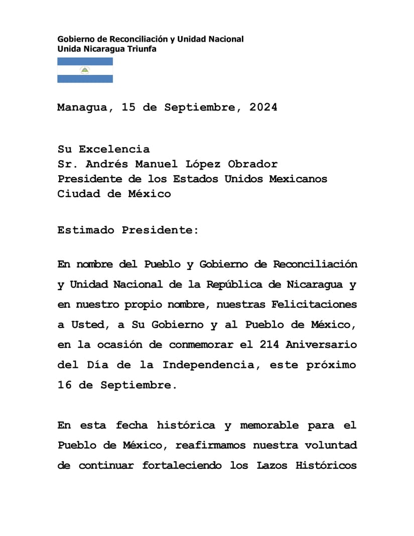 En nombre del Pueblo y Gobierno de Reconciliación y Unidad Nacional de la República de Nicaragua y en nuestro propio nombre, nuestras Felicitaciones a Usted, a Su Gobierno y al Pueblo de México, en la ocasión de conmemorar el 214 Aniversario del Día de la Independencia, este próximo 16 de Septiembre.