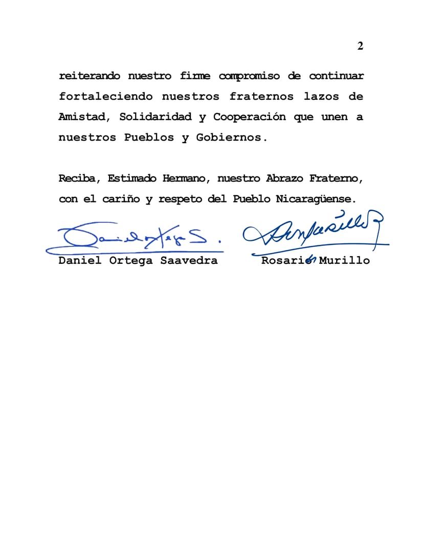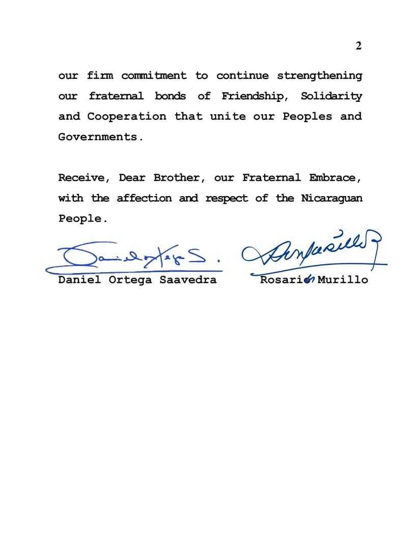 Desde nuestra Nicaragua Bendita y Siempre Libre, nos unimos en esta memorable celebración, reiterando nuestro firme compromiso de continuar fortaleciendo nuestros fraternos lazos de Amistad, Solidaridad y Cooperación que unen a nuestros Pueblos y Gobiernos.