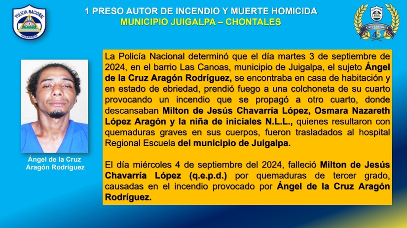"Ángel de la Cruz Aragón Rodríguez, nuestra Policía Nacional determinó que el día martes 3 de septiembre de 2024, en el barrio Las Canoas, municipio de Juigalpa, el sujeto Ángel de la Cruz Aragón Rodríguez se encontraba en su casa de habitación y en estado de ebriedad prendió fuego a una colchoneta de su cuarto, provocando un incendio que se propagó a otros lugares de la habitación, donde descansaban Milton de Jesús Chavarría López, Omar Nazaret López Aragón y la niña de iniciales N.L.L., quienes resultaron con quemaduras graves en el cuerpo y fueron trasladados al Hospital Regional Escuela del municipio de Juigalpa", detalló.