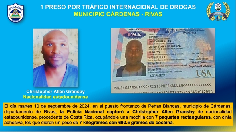 También capturaron a un sujeto por tráfico internacional de drogas en el municipio de Cárdenas, Rivas, el ciudadano estadounidense Christopher Allen Gransby.