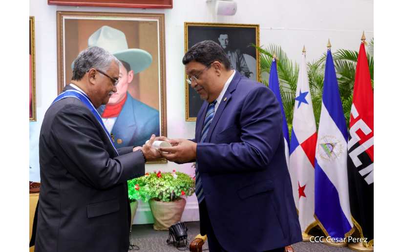 El Gobierno de Reconciliación y Unidad Nacional a través del Canciller Valdrack Jaentschke condecoró con la Orden José de Marcoleta en Grado de Gran Cruz al Excelentísimo Sr. José de Jesús Martínez, Embajador Extraordinario y Plenipotenciario de Panamá, quien concluye su misión diplomática en el país tras un periodo de 5 años.