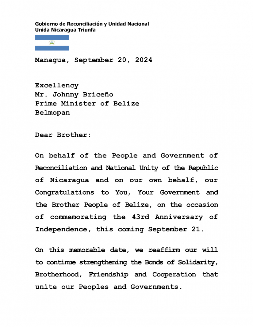 On behalf of the People and Government of Reconciliation and National Unity of the Republic of Nicaragua and on our own behalf, our Congratulations to You, Your Government and the Brother People of Belize, on the occasion of commemorating the 43rd Anniversary of Independence, this coming September 21.