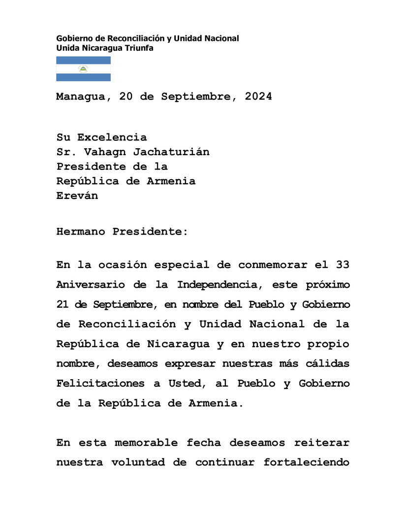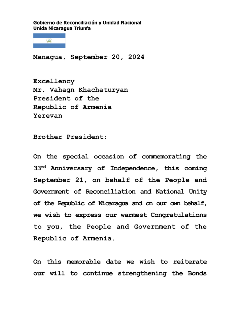 En la ocasión especial de conmemorar el 33 Aniversario de la Independencia, este próximo 21 de Septiembre, en nombre del Pueblo y Gobierno de Reconciliación y Unidad Nacional de la República de Nicaragua y en nuestro propio nombre, deseamos expresar nuestras más cálidas Felicitaciones a Usted, al Pueblo y Gobierno de la República de Armenia.