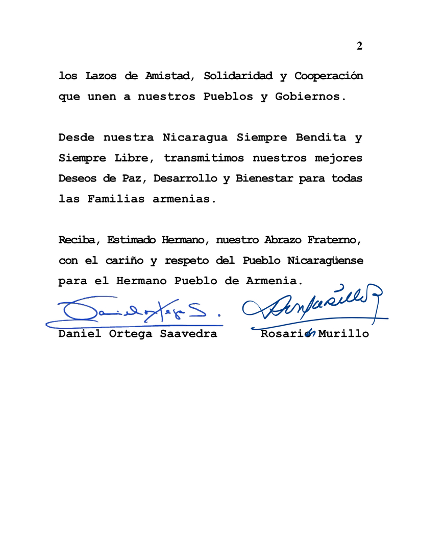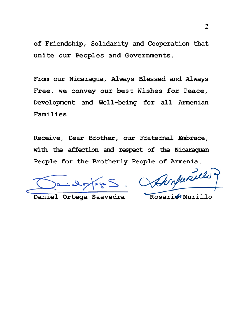 Reciba, Estimado Hermano, nuestro Abrazo Fraterno, con el cariño y respeto del Pueblo Nicaragüense para el Hermano Pueblo de Armenia.