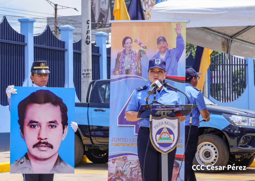 “Estamos inaugurando esta moderna, bonita y funcional unidad policial del distrito VI de Managua, en septiembre, un mes que recoge la sangre de tantos hombres y mujeres, que abonaron esta tierra bendita, para que hoy la estemos viendo florecer, gesta como la de Rigoberto López Pérez, que ajustició al tirano Somoza García y que dio inicio al principio del fin de la dictadura somocista, la sangre de Héroes y Mártires de Nandaime, hombres y mujeres como el Comandante Guerrillero Marcos Somarriba, quién durante la insurrección de Managua se convirtió en el Héroe de la defensa de los barrios orientales y que no permitió el ingreso de la guardia genocida por la carretera norte”, comentó.