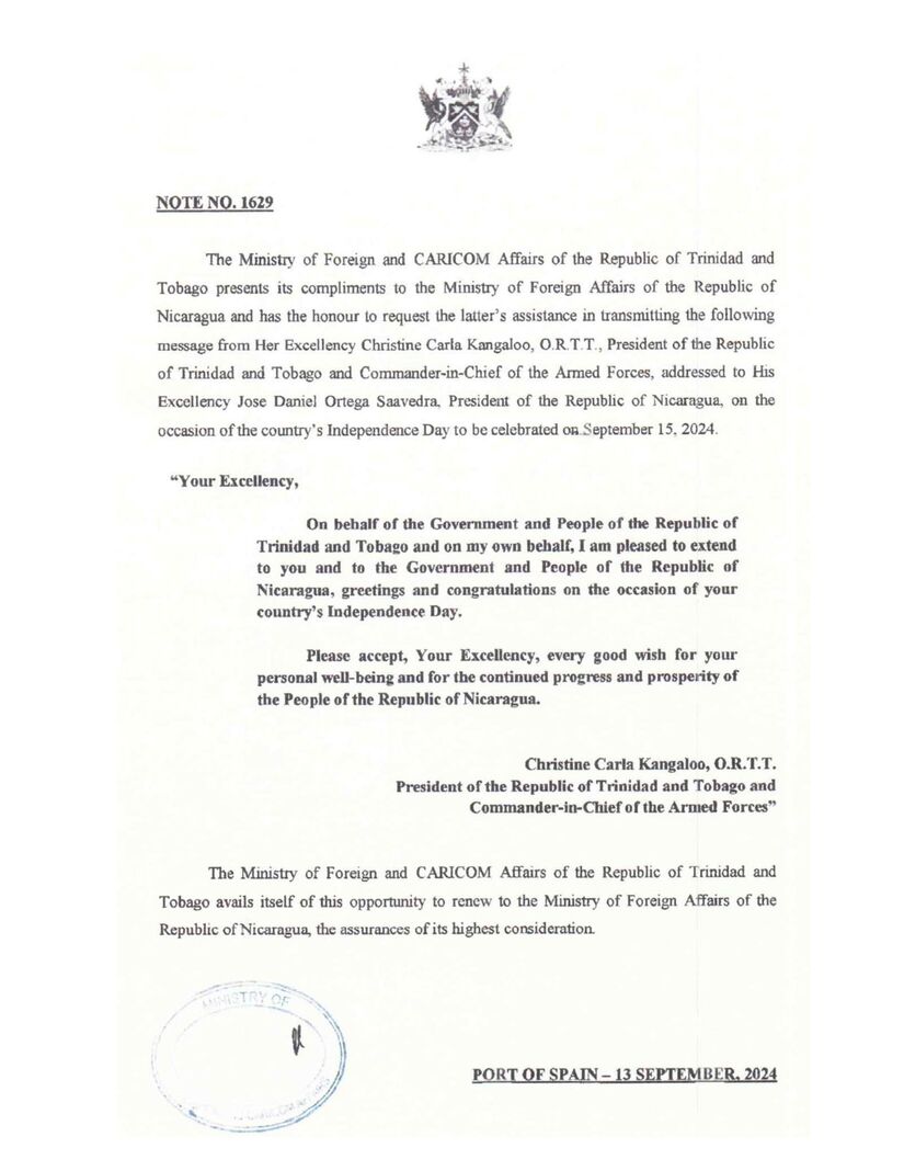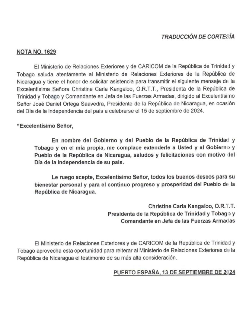 Mensaje de Felicitación de la Excelentísima Hermana Christine Carla Kangaloo, O.R.T.T., Presidenta de la República de Trinidad y Comandante en Jefa de las Fuerzas Armadas, a nuestro Pueblo y Gobierno, en ocasión del Día de la Independencia de Nicaragua.