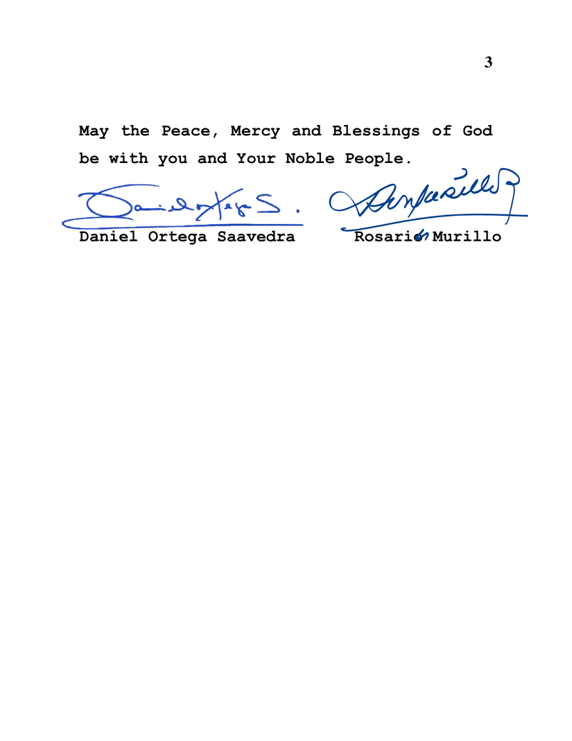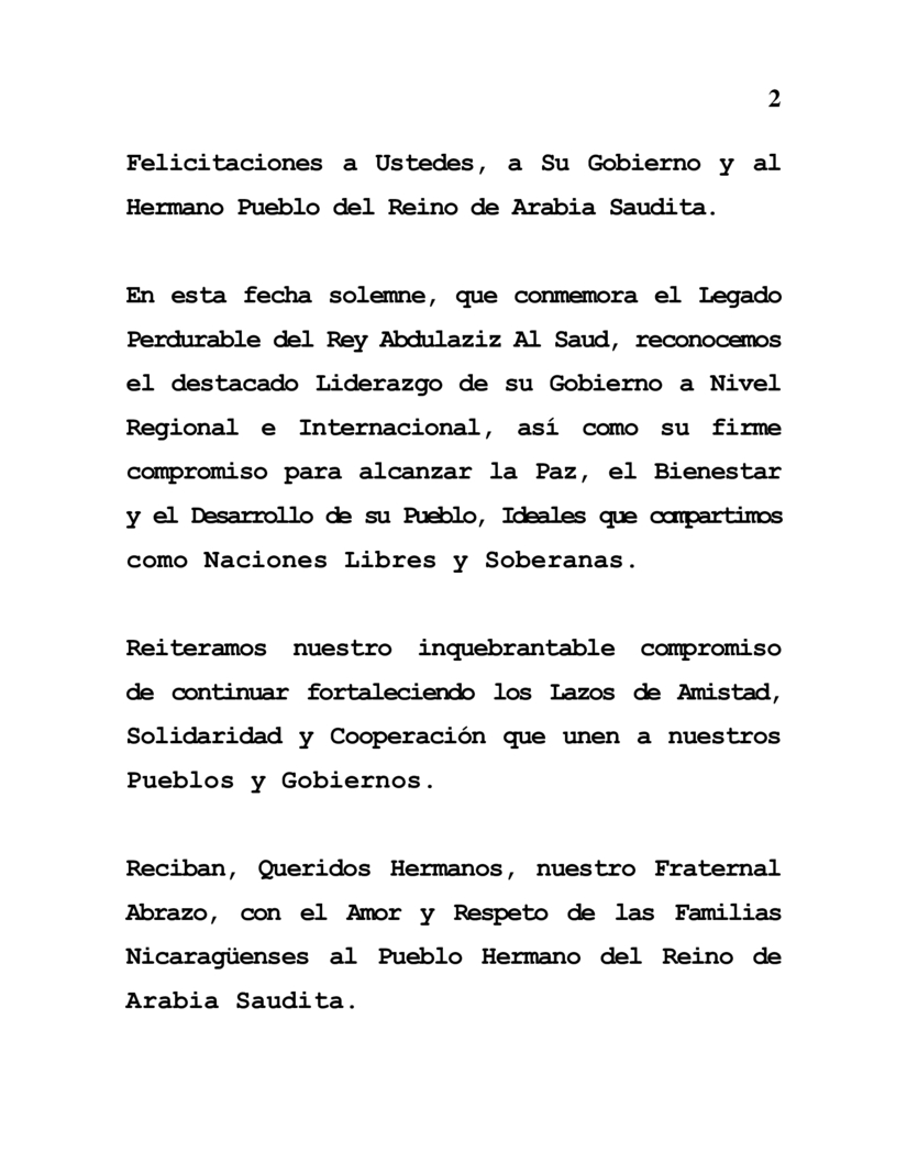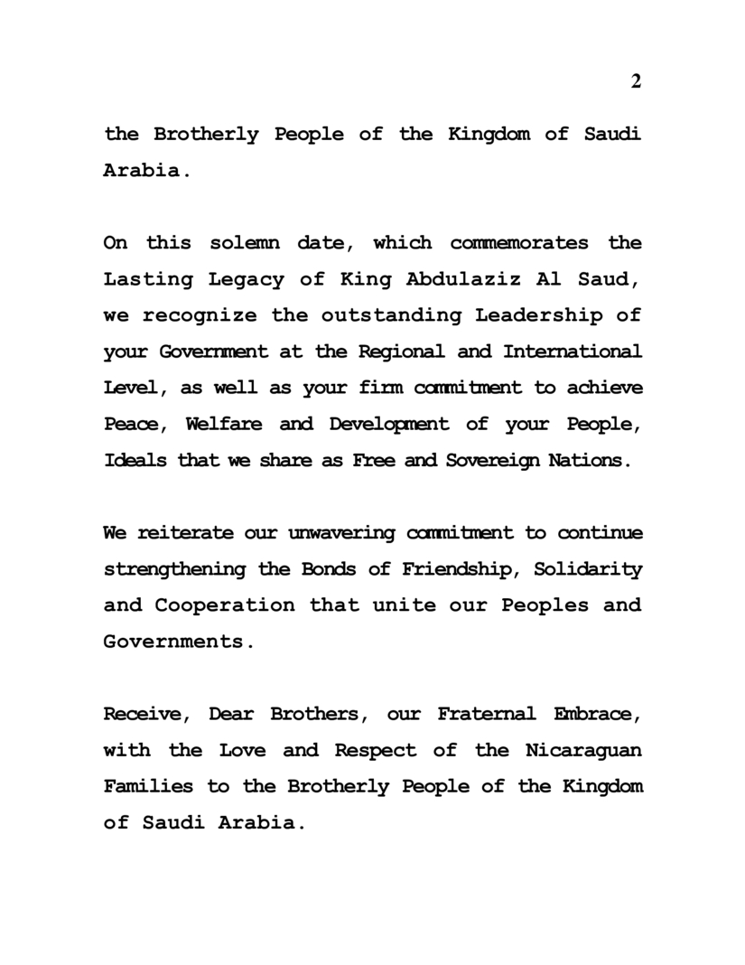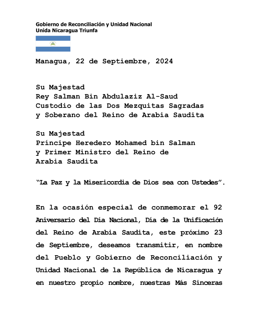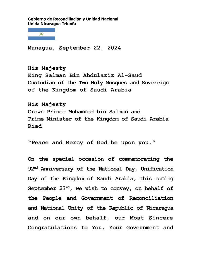 En la ocasión especial de conmemorar el 92 Aniversario del Día Nacional, Día de la Unificación del Reino de Arabia Saudita, este próximo 23 de Septiembre, deseamos transmitir, en nombre del Pueblo y Gobierno de Reconciliación y Unidad Nacional de la República de Nicaragua y en nuestro propio nombre, nuestras Más Sinceras Felicitaciones a Ustedes, a Su Gobierno y al Hermano Pueblo del Reino de Arabia Saudita.