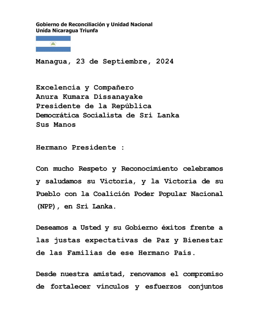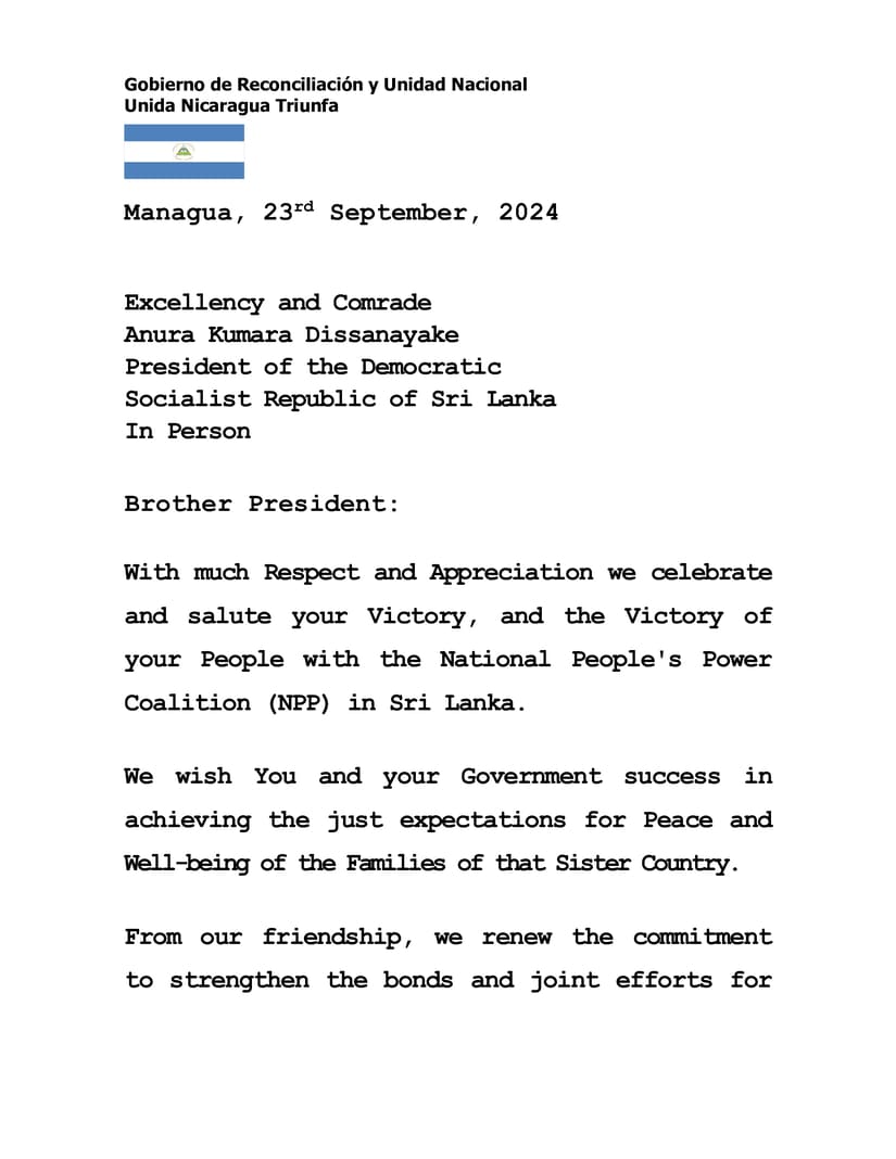 Con mucho Respeto y Reconocimiento celebramos y saludamos su Victoria, y la Victoria de su Pueblo con la Coalición Poder Popular Nacional (NPP), en Sri Lanka.