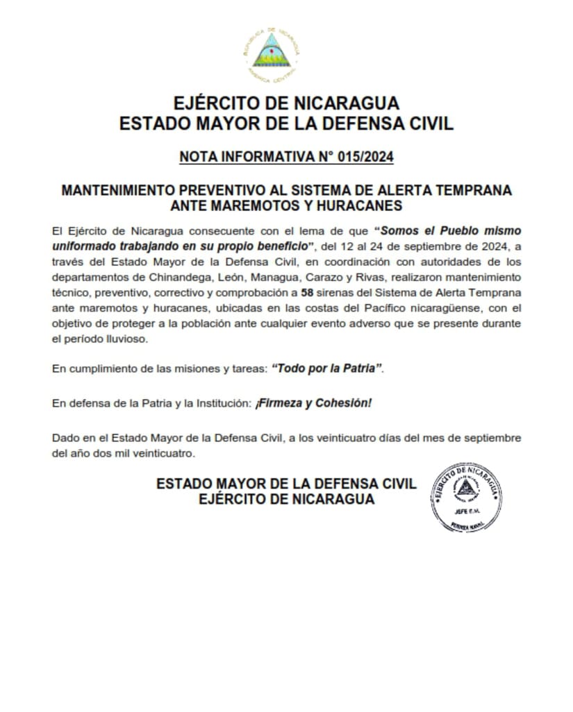El Ejército de Nicaragua consecuente con el lema de que “Somos el Pueblo mismo uniformado trabajando en su propio beneficio”, del 12 al 24 de septiembre de 2024, a través del Estado Mayor de la Defensa Civil, en coordinación con autoridades de los departamentos de Chinandega, León, Managua, Carazo y Rivas, realizaron mantenimiento técnico, preventivo, correctivo y comprobación a 58 sirenas del Sistema de Alerta Temprana ante maremotos y huracanes, ubicadas en las costas del Pacífico nicaragüense, con el objetivo de proteger a la población ante cualquier evento adverso que se presente durante el período lluvioso.