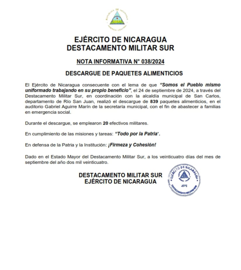 El Ejército de Nicaragua consecuente con el lema de que “Somos el Pueblo mismo uniformado trabajando en su propio beneficio”, el 24 de septiembre de 2024, a través del Destacamento Militar Sur, en coordinación con la alcaldía municipal de San Carlos, departamento de Río San Juan, realizó el descargue de 839 paquetes alimenticios, en el auditorio Gabriel Aguirre Marín de la secretaría municipal, con el fin de abastecer a familias en emergencia social.