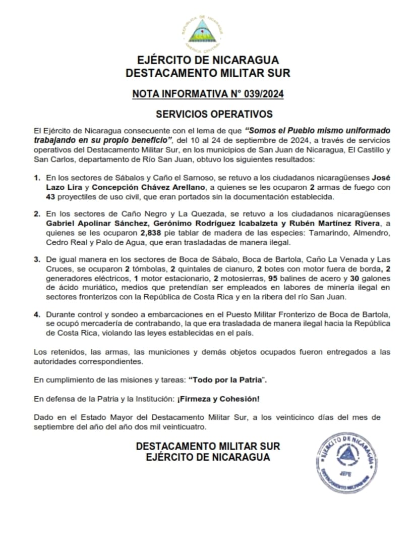 El Ejército de Nicaragua consecuente con el lema de que “Somos el Pueblo mismo uniformado trabajando en su propio beneficio”, del 10 al 24 de septiembre de 2024, a través de servicios operativos del Destacamento Militar Sur, en los municipios de San Juan de Nicaragua, El Castillo y San Carlos, departamento de Río San Juan, obtuvo los siguientes resultados: