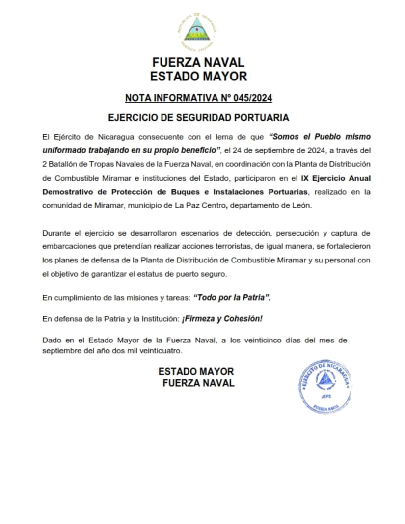 El Ejército de Nicaragua consecuente con el lema de que “Somos el Pueblo mismo uniformado trabajando en su propio beneficio”, el 24 de septiembre de 2024, a través del 2 Batallón de Tropas Navales de la Fuerza Naval, en coordinación con la Planta de Distribución de Combustible Miramar e instituciones del Estado, participaron en el IX Ejercicio Anual Demostrativo de Protección de Buques e Instalaciones Portuarias, realizado en la comunidad de Miramar, municipio de La Paz Centro, departamento de León.