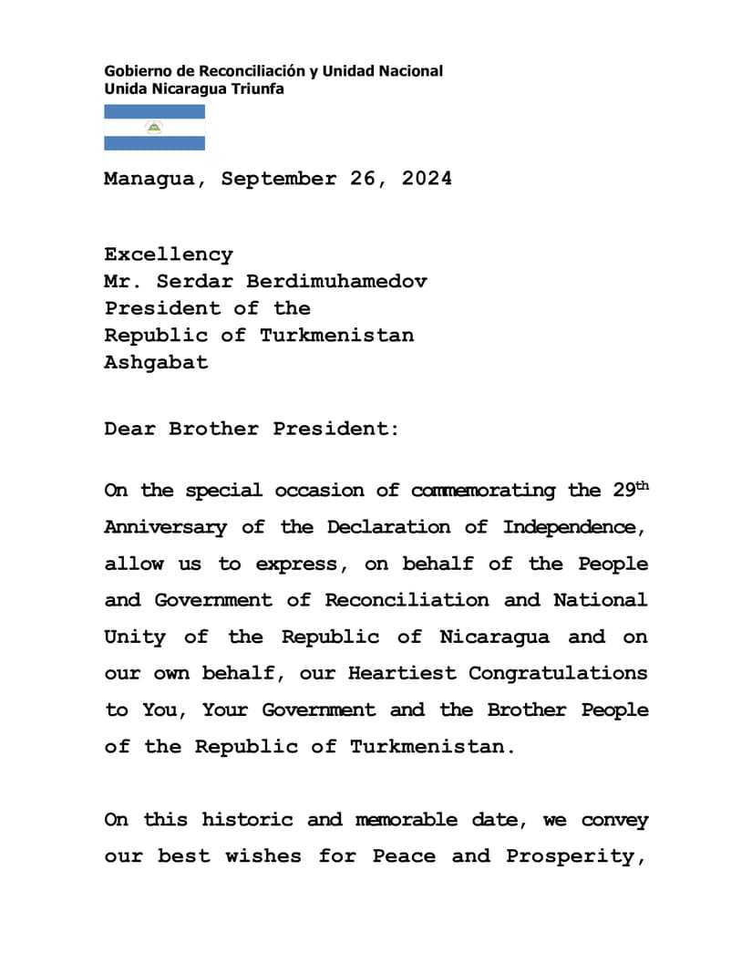 En la ocasión especial de conmemorar el 29 Aniversario de la Declaración de la Independencia, permítanos expresar, en nombre del Pueblo y Gobierno de Reconciliación y Unidad Nacional de la República de Nicaragua y en nuestro propio nombre, nuestras Más Sinceras Felicitaciones a Usted, a Su Gobierno y al Hermano Pueblo de la República de Turkmenistán.