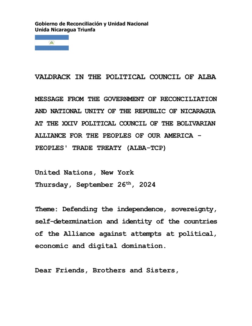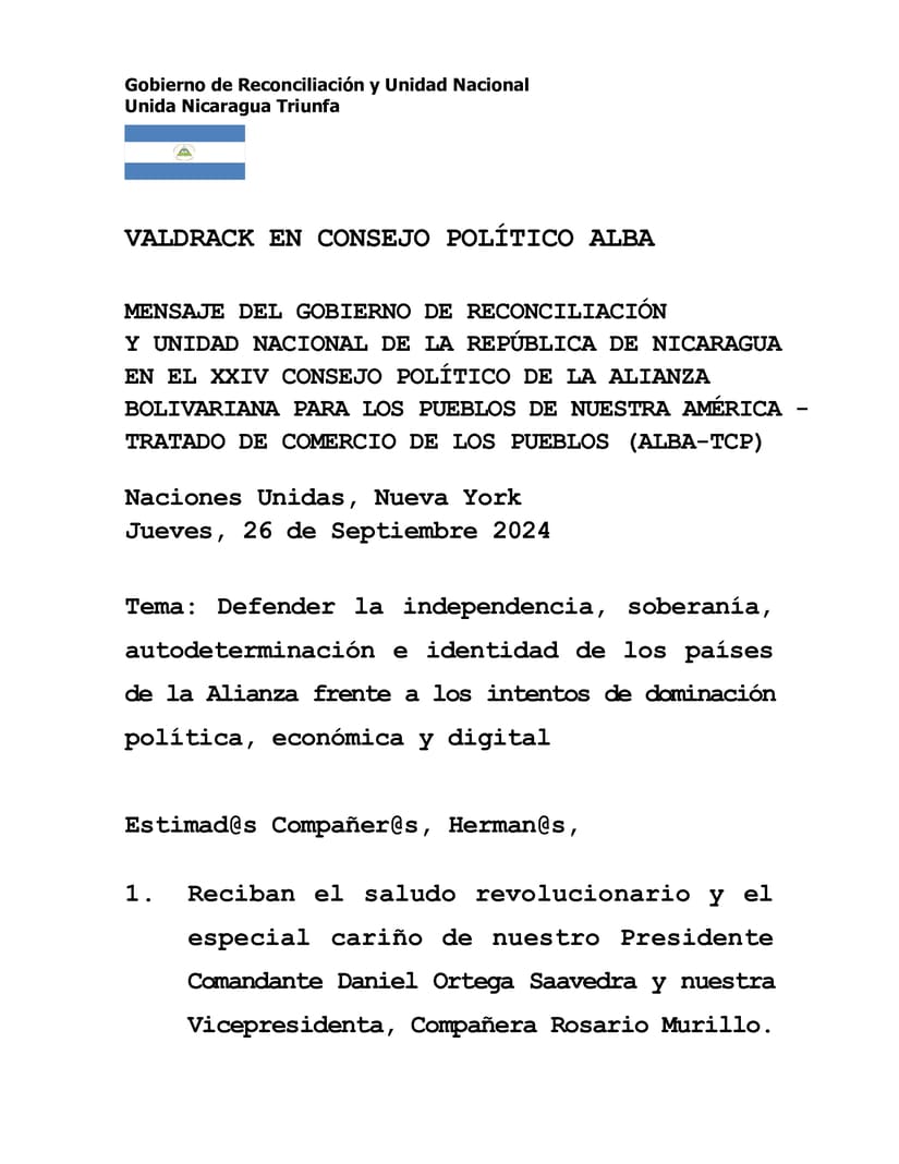 Mensaje de nuestro Gobierno, pronunciado por el Compañero Valdrack Jaentschke, Canciller de Nicaragua, en el XXIV Consejo Político de la Alianza Bolivariana para los Pueblos de Nuestra América-Tratado de Comercio de los Pueblos (ALBA-TCP), realizado hoy en Naciones Unidas, Nueva York.