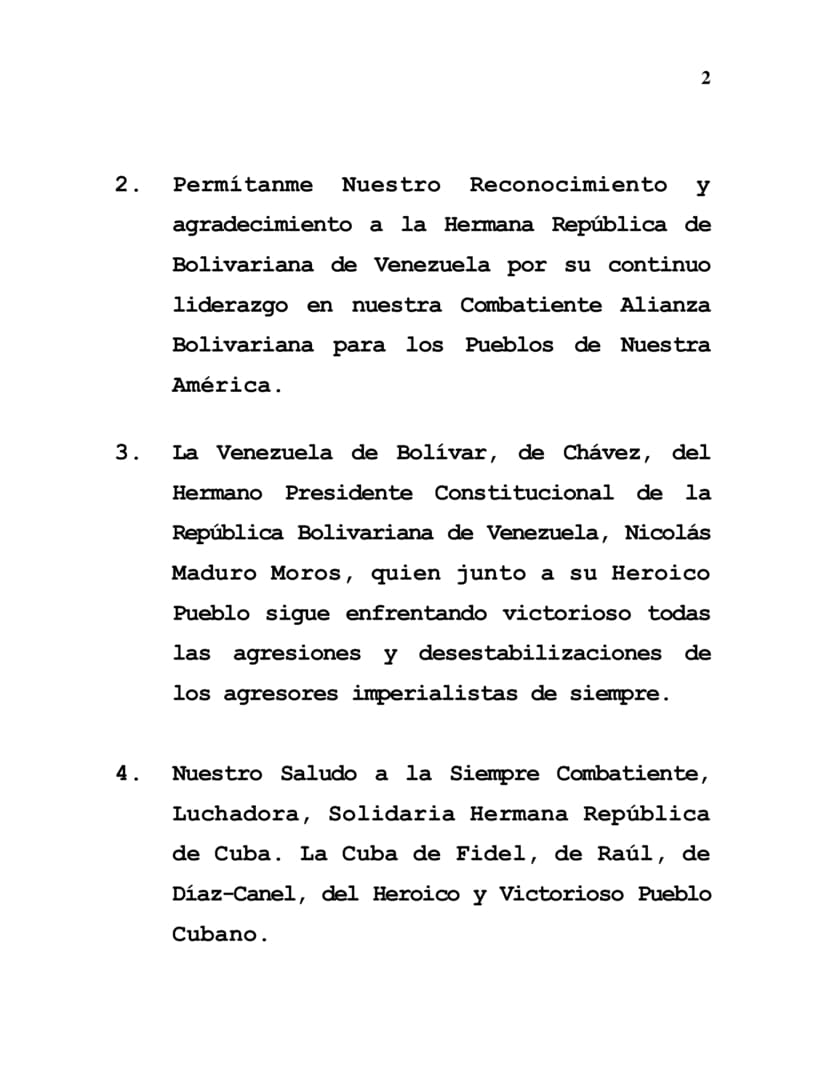 3. The Venezuela of Bolívar, of Chávez, of our Brother, Constitutional President of the Bolivarian Republic of Venezuela, Nicolás Maduro Moros, who together with his Heroic People continues to face victoriously all the aggressions and destabilizations of the usual imperialist aggressors.