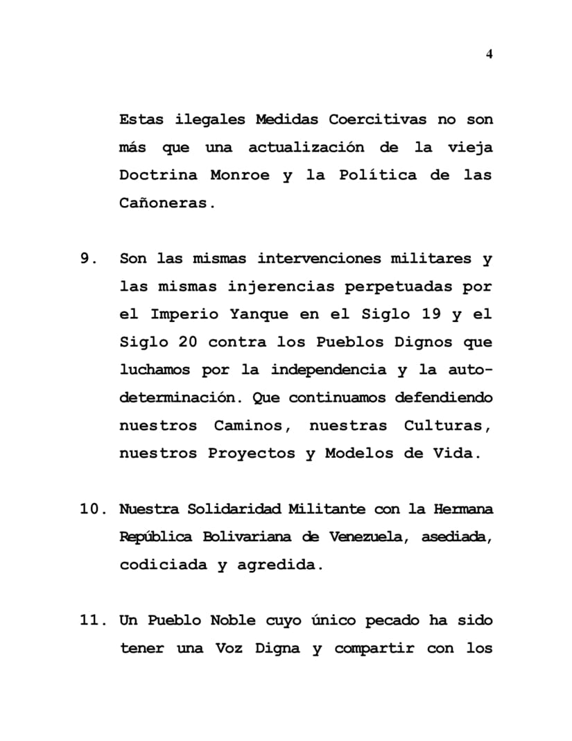 9. These are the same military interventions and the same interferences perpetrated by the Yankee Empire in the 19th and 20th century against all our Dignified Peoples who have fought for independence and self-determination and who continue to defend our Paths, our Cultures, our Projects and Ways of Life.