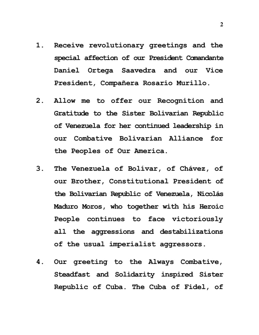 2. Allow me to offer our Recognition and Gratitude to the Sister Bolivarian Republic of Venezuela for her continued leadership in our Combative Bolivarian Alliance for the Peoples of Our America.