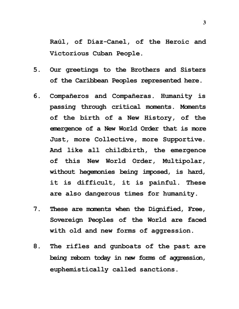 4. Our greeting to the Always Combative, Steadfast and Solidarity inspired Sister Republic of Cuba. The Cuba of Fidel, of Raúl, of Díaz-Canel, of the Heroic and Victorious Cuban People.