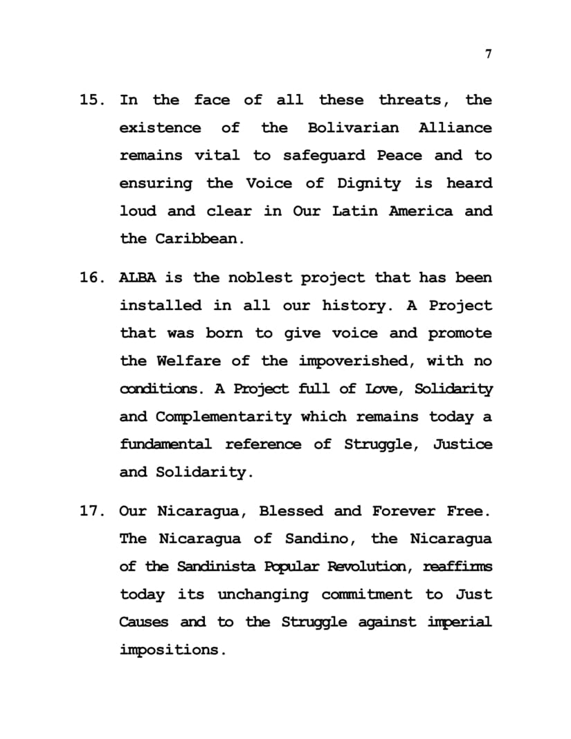 7. Son Momentos en que los Pueblos Dignos, Libres y Soberanos del Mundo nos enfrentamos a formas, viejas y nuevas, de agresiones.
