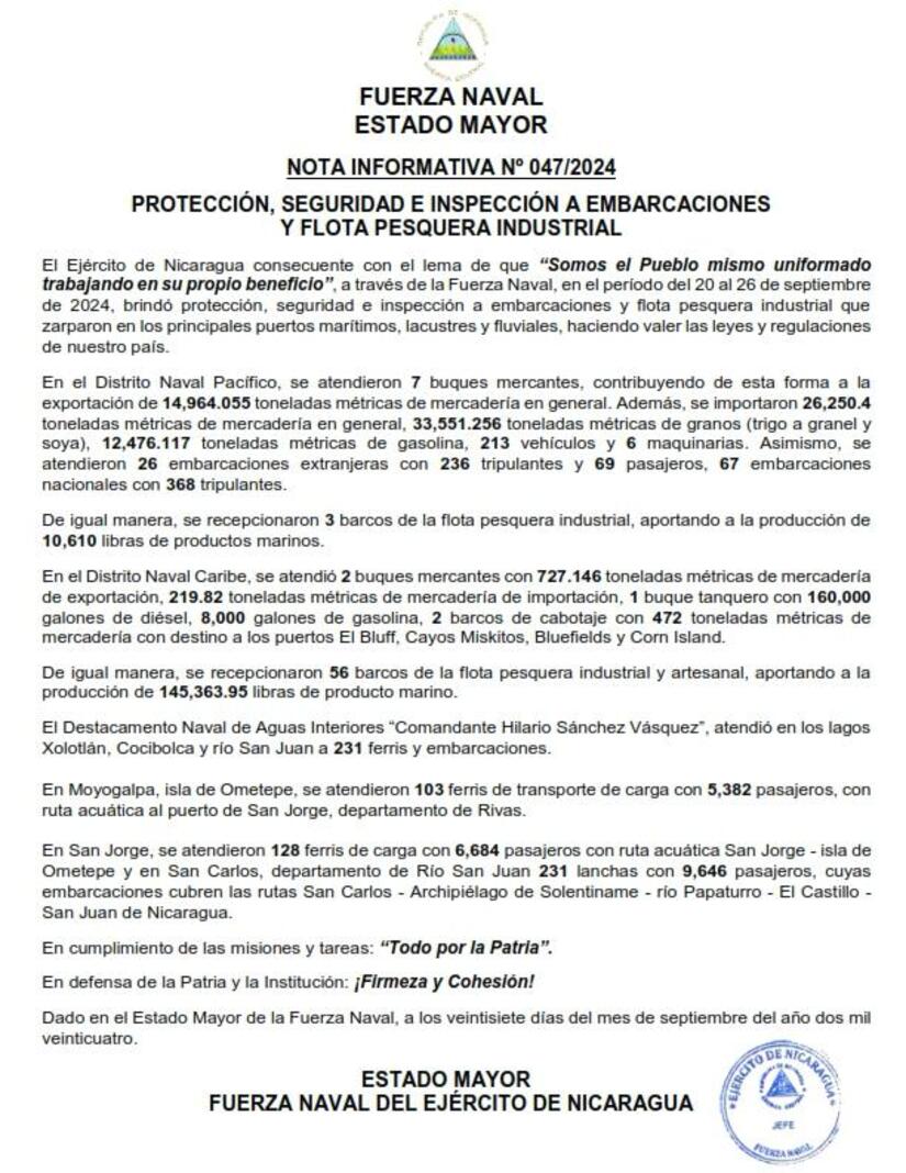 El Ejército de Nicaragua consecuente con el lema de que "Somos el Pueblo mismo uniformado trabajando en su propio beneficio", a través de la Fuerza Naval, en el período del 20 al 26 de septiembre de 2024, brindó protección, seguridad e inspección a embarcaciones y flota pesquera industrial que zarparon en los principales puertos maritimos, lacustres y fluviales, haciendo valer las leyes y regulaciones de nuestro país.