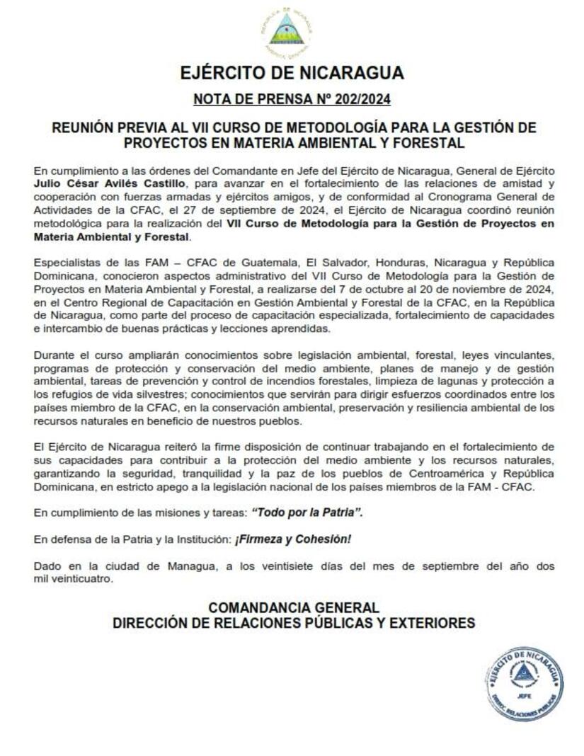 En cumplimiento a las órdenes del Comandante en Jefe del Ejército de Nicaragua, General de Ejército Julio César Avilés Castillo, para avanzar en el fortalecimiento de las relaciones de amistad y cooperación con fuerzas armadas y ejércitos amigos, y de conformidad al Cronograma General de Actividades de la CFAC, el 27 de septiembre de 2024, el Ejército de Nicaragua coordinó reunión metodológica para la realización del VII Curso de Metodología para la Gestión de Proyectos en Materia Ambiental y Forestal.
