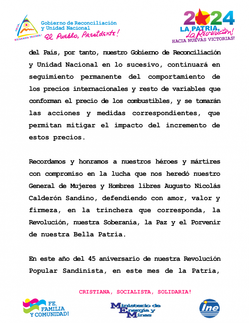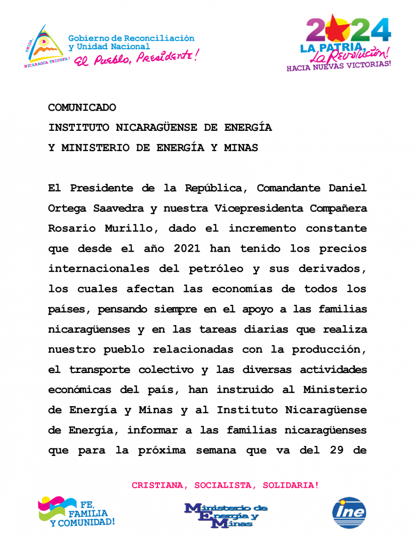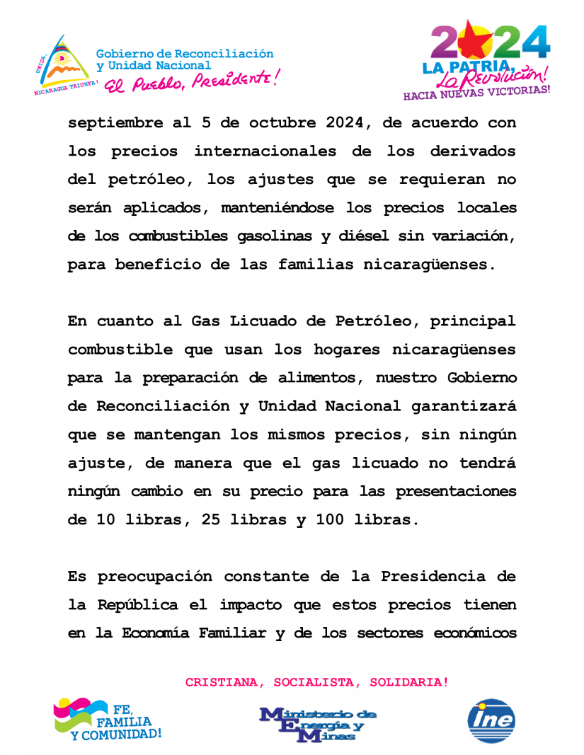 El Presidente de la República, Comandante Daniel Ortega Saavedra y nuestra Vicepresidenta Compañera Rosario Murillo, dado el incremento constante que desde el año 2021 han tenido los precios internacionales del petróleo y sus derivados, los cuales afectan las economías de todos los países, pensando siempre en el apoyo a las familias nicaragüenses y en las tareas diarias que realiza nuestro pueblo relacionadas con la producción, el transporte colectivo y las diversas actividades económicas del país, han instruido al Ministerio de Energía y Minas y al Instituto Nicaragüense de Energía, informar a las familias nicaragüenses que para la próxima semana que va del 29 de septiembre al 5 de octubre 2024, de acuerdo con los precios internacionales de los derivados del petróleo, los ajustes que se requieran no serán aplicados, manteniéndose los precios locales de los combustibles gasolinas y diésel sin variación, para beneficio de las familias nicaragüenses.