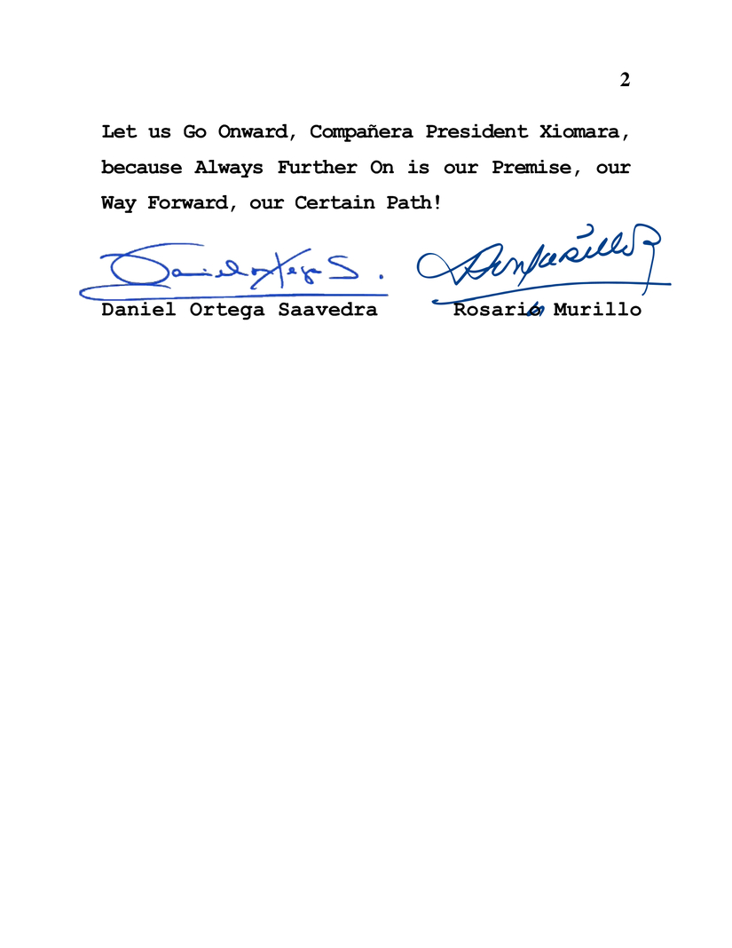 Mensaje de Saludos y Felicitaciones del Presidente Comandante Daniel Ortega y Compañera Rosario Murillo, a la Compañera y Hermana Xiomara Castro de Zelaya, Presidenta de la República de Honduras, en ocasión de su Cumpleaños.