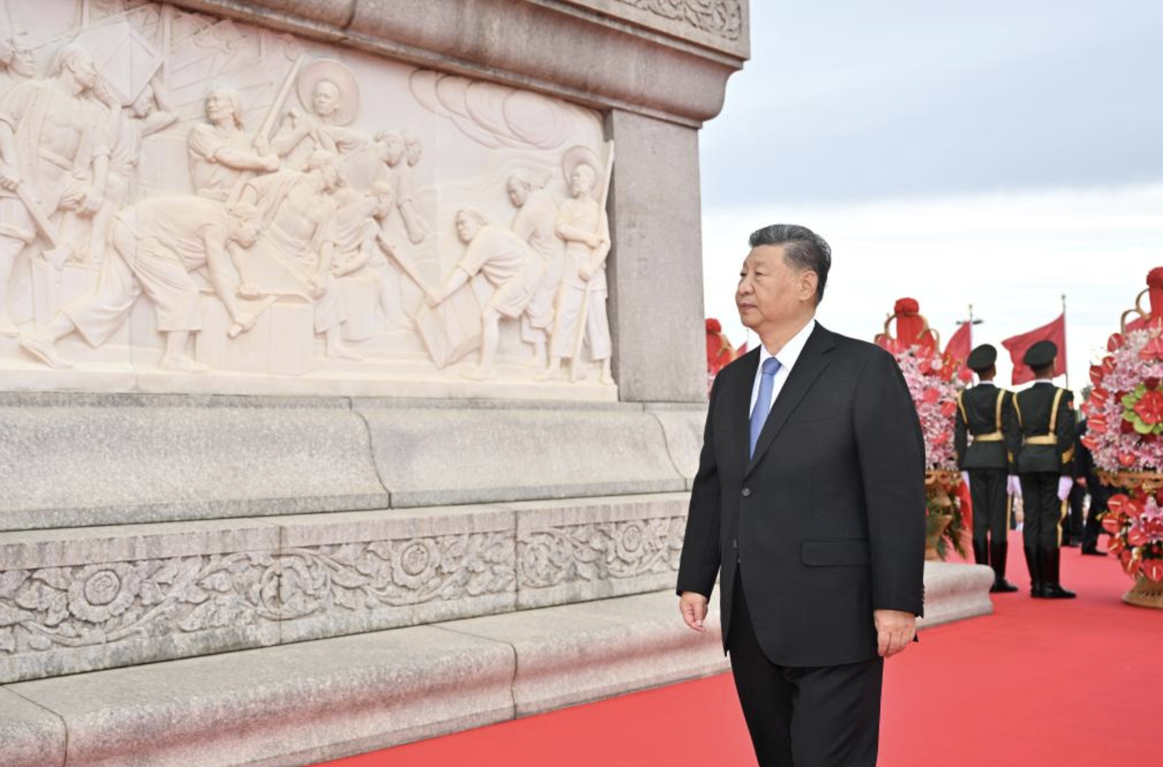 Xi y los otros líderes se acercaron a la base del monumento, donde el presidente acomodó las cintas de las ofrendas antes de dirigir a otros funcionarios en un recorrido alrededor del monumento para presentar sus respetos.