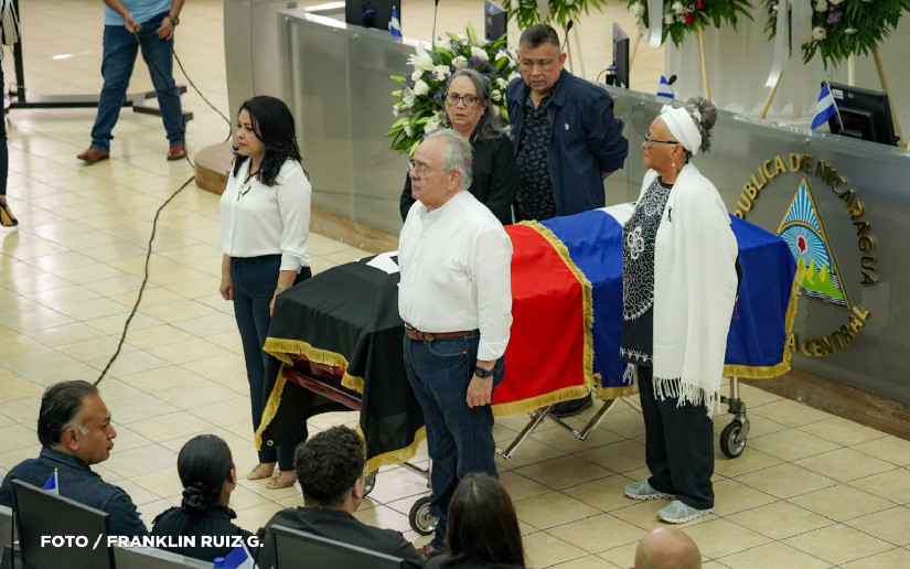 “Rendimos honores al compañero Enrique Aldana, un compañero militante sandinista, productor, diputado, nos toca hacerle entrega a sus hijos, a su familia, de las banderas de nuestra patria, la bandera azul y blanco que nos cubre a todos, digna, bella que cubre a todos los nicaragüenses y la bandera rojinegra que rescató la dignidad de la bandera azul y blanco. La bandera rojinegra del Frente Sandinista, la bandera del partido que nos da la vida, que le dio la vida a Enrique Aldana y que le continuará dando vida en esta Nicaragua libre, próspera, digna, independiente, soberana, autodeterminada con la frente en alto. Siempre tengamos presente que la defensa de estas banderas , el mantenerlas en alto fue uno de los actos que siempre hizo Enrique Aldana”, destacó el doctor Gustavo Porras, presidente de la Junta Directiva.