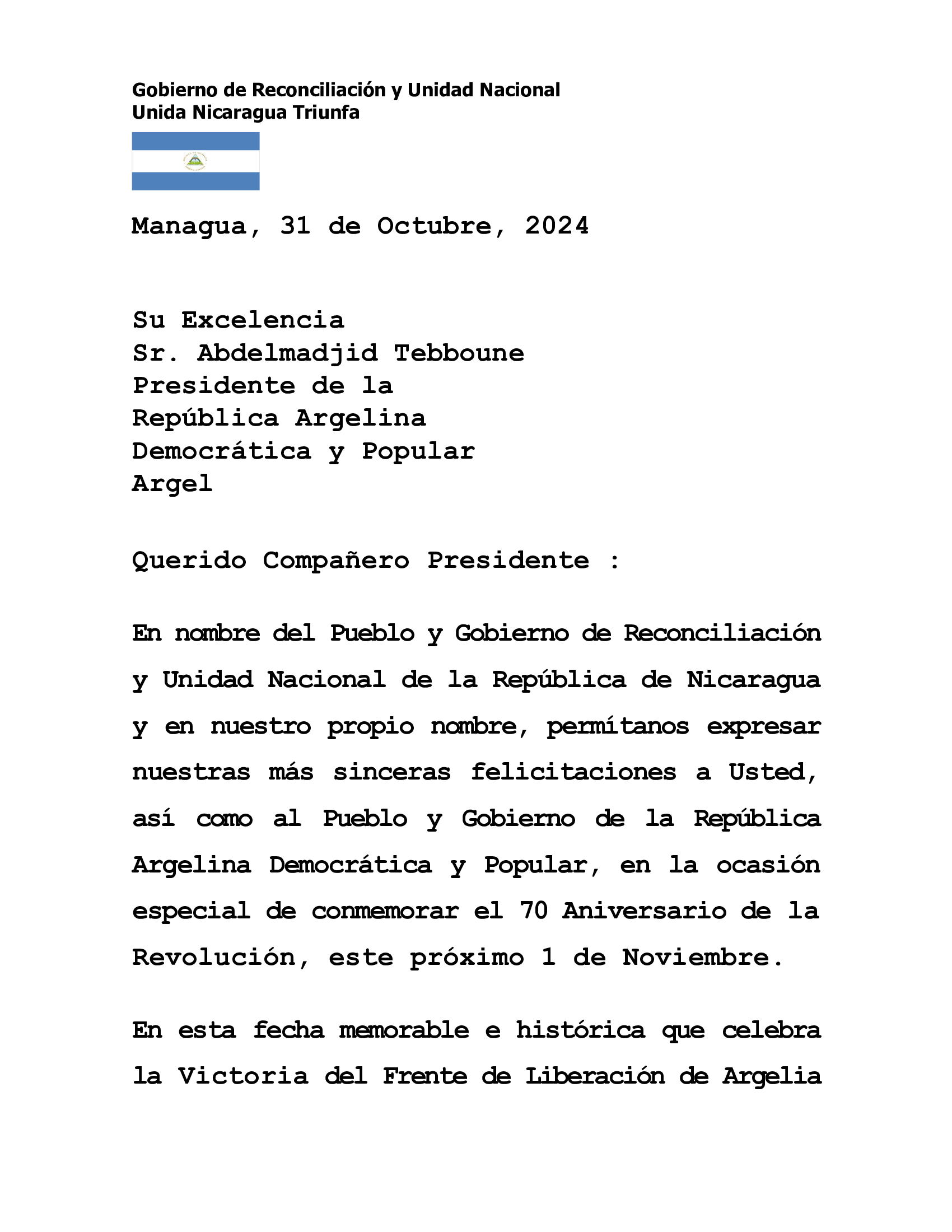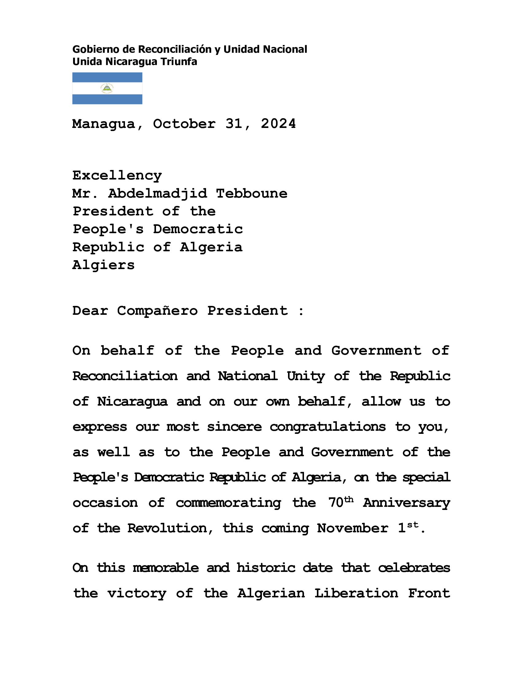 En nombre del Pueblo y Gobierno de Reconciliación y Unidad Nacional de la República de Nicaragua y en nuestro propio nombre, permítanos expresar nuestras más sinceras felicitaciones a Usted, así como al Pueblo y Gobierno de la República Argelina Democrática y Popular, en la ocasión especial de conmemorar el 70 Aniversario de la Revolución, este próximo 1 de Noviembre.