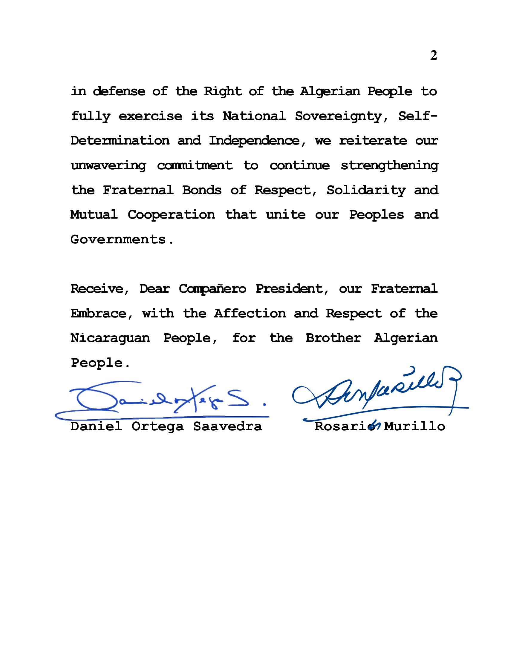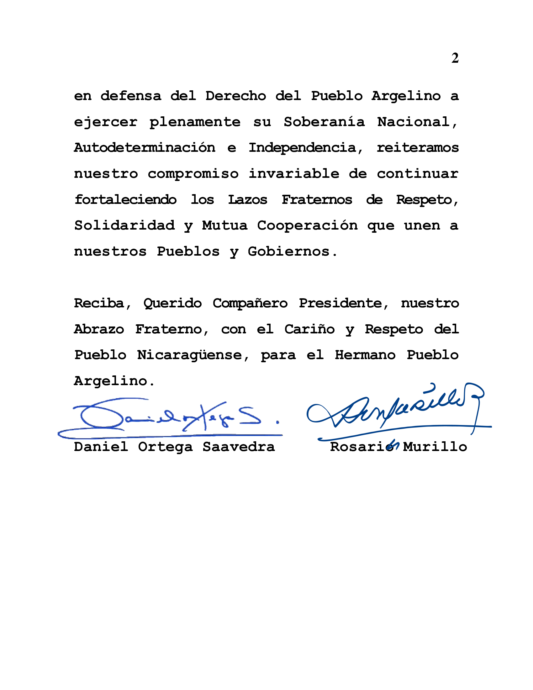 Reciba, Querido Compañero Presidente, nuestro Abrazo Fraterno, con el Cariño y Respeto del Pueblo Nicaragüense, para el Hermano Pueblo Argelino.