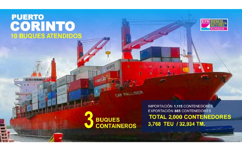 El compañero Carlos Aburto, Gerente General de la Empresa Portuaria Nacional, detalló que al país arribaron 12 buques. En el Puerto Corinto, se atendió 10 barcos internacionales, entre estos 3 buques container que importaron 1 mil 115 contenedores con artículos escolares, electrodomésticos y cerámicas, provenientes de México y República Popular China, con un total 17 mil 805 toneladas métricas.