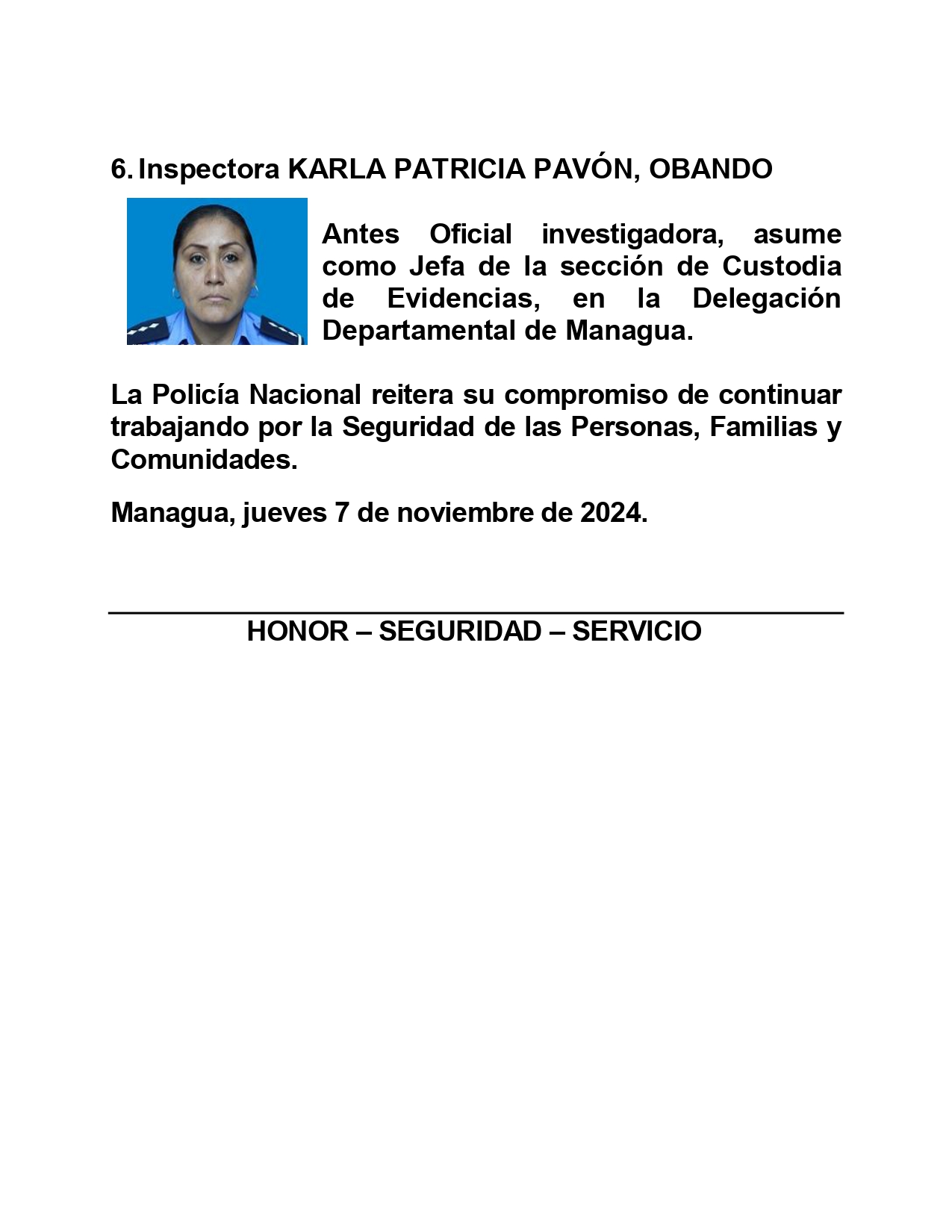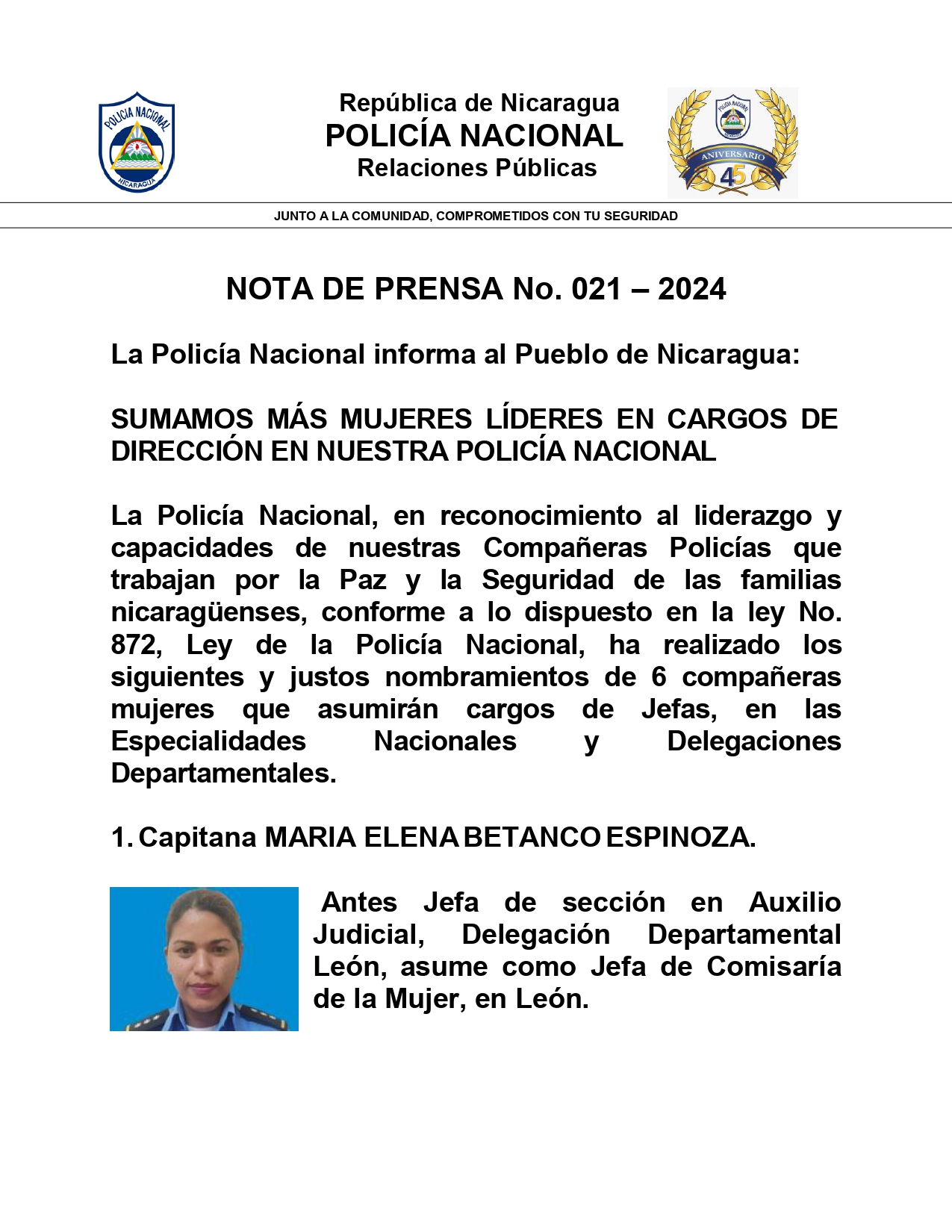 La Policía Nacional, en reconocimiento al liderazgo y capacidades de nuestras Compañeras Policías que trabajan por la Paz y la Seguridad de las familias nicaragüenses, conforme a lo dispuesto en la ley No. 872, Ley de la Policía Nacional, ha realizado los siguientes y justos nombramientos de 6 compañeras mujeres que asumirán cargos de Jefas, en las Especialidades Nacionales y Delegaciones Departamentales.