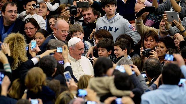 En una abarrotada aula el pontífice saludó a trabajadores del ente audiovisual y besó a los niños, así como también agradeció a los presentes por "ser tan numerosos".