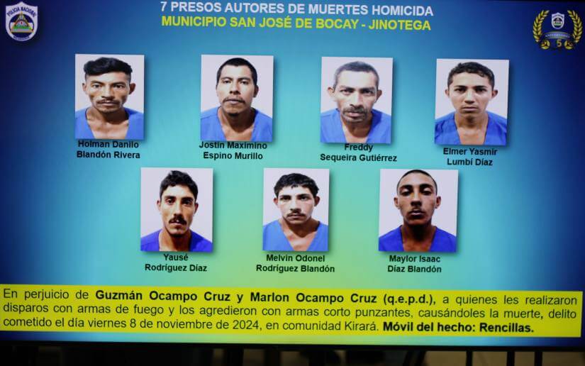 “Se capturó a siete sujetos autores de muerte homicida en el municipio de San José de Bocay, Jinotega, Holman Danilo Blandón Rivera, Jostin Maximino Espino Murillo, Freddy Sequeira Gutiérrez, Elmer Yasmir Lumbí Díaz, Yausé Rodríguez Díaz, Melvin Odonel Rodríguez Blandón, Maylor Isaac Díaz Blandón, en perjuicio de Guzmán Ocampo Cruz y Marlon Ocampo Cruz (q.e.p.d.), a quienes les realizaron disparos con armas de fuego y los agredieron con armas corto punzantes, causándoles la muerte, delito cometido el día viernes 8 de noviembre de 2024, en comunidad Kirará, además, se les incautó tres rifles, una escopeta, tres revólver y una pistola”, detalló.
