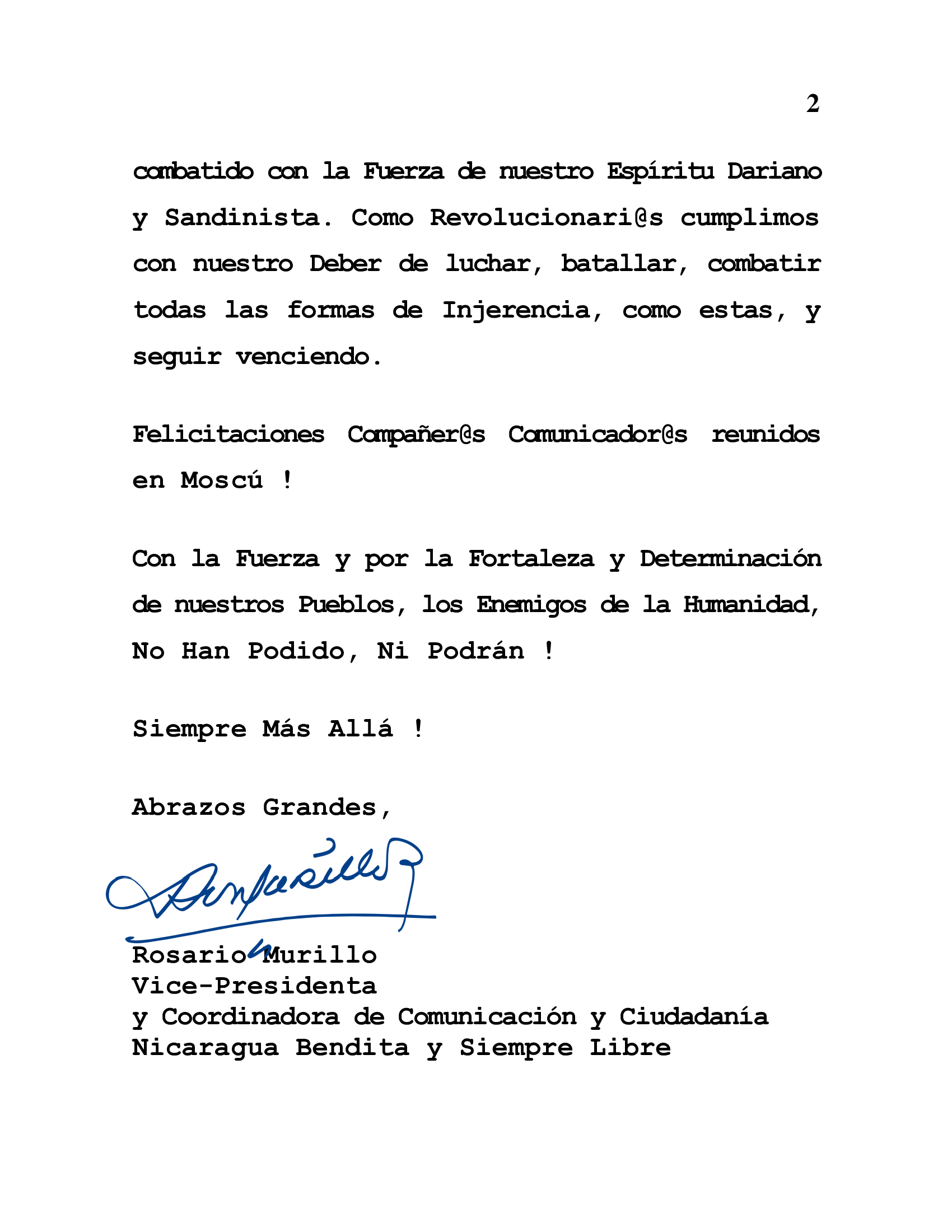 Conocemos la malignidad, la perversidad de intervenir, para desestabilizar, las Autonomías, Soberanías e Independencias de nuestros Pueblos, y los hemos combatido con la Fuerza de nuestro Espíritu Dariano y Sandinista. Como Revolucionari@s cumplimos con nuestro Deber de luchar, batallar, combatir todas las formas de Injerencia, como estas, y seguir venciendo.