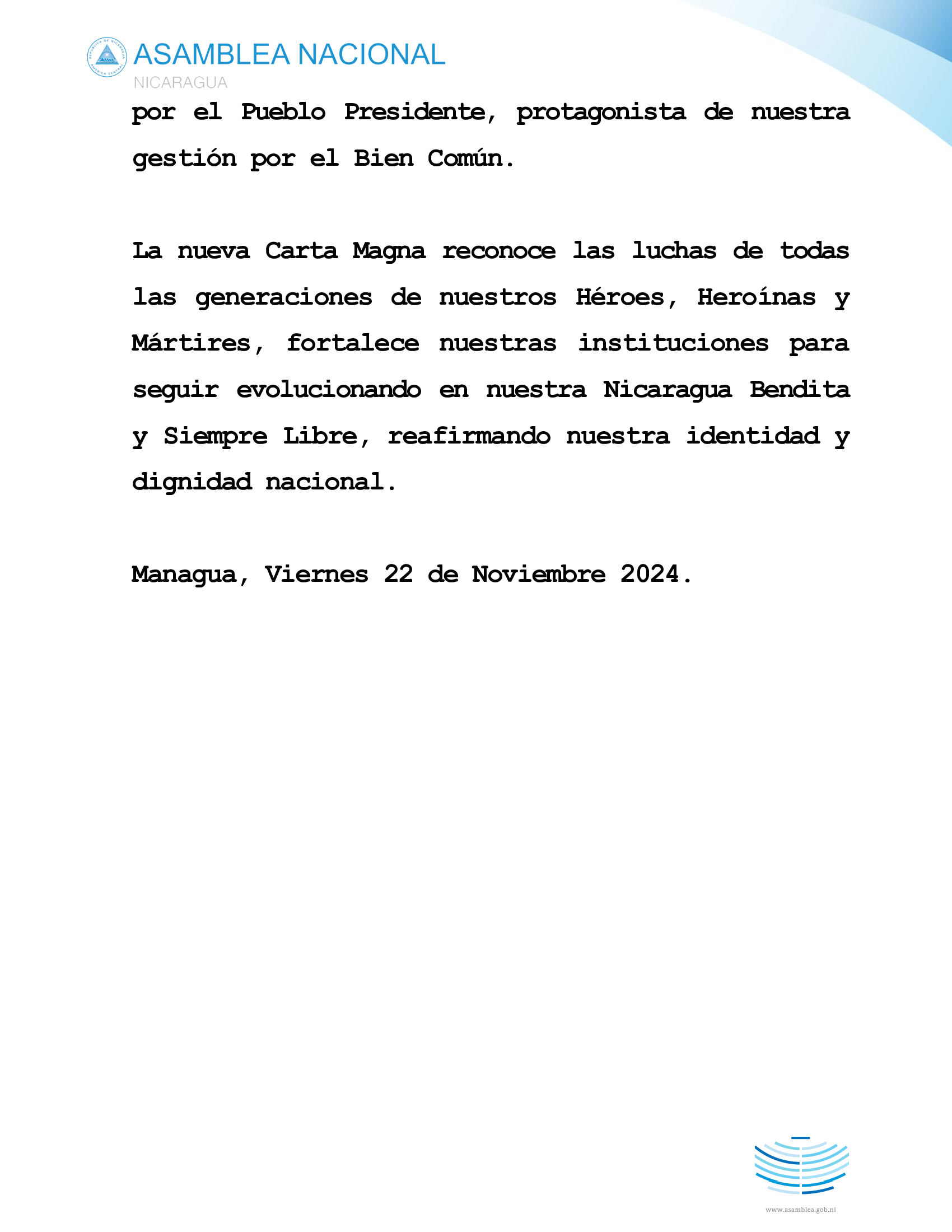 La nueva Carta Magna reconoce las luchas de todas las generaciones de nuestros Héroes, Heroínas y Mártires, fortalece nuestras instituciones para seguir evolucionando en nuestra Nicaragua Bendita y Siempre Libre, reafirmando nuestra identidad y dignidad nacional.