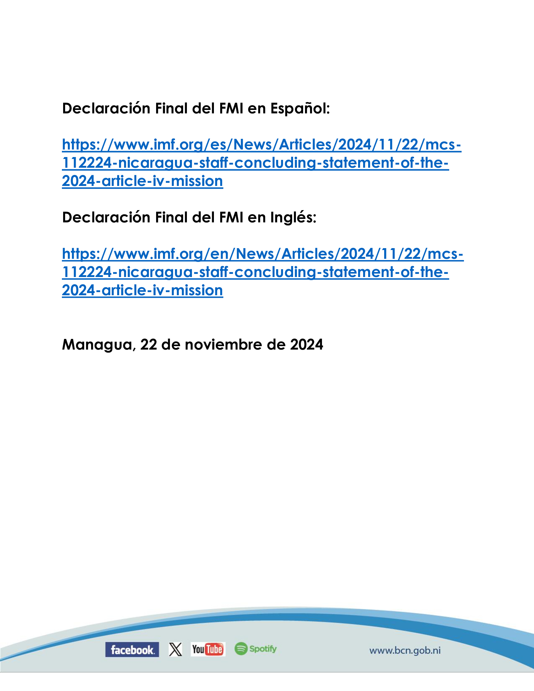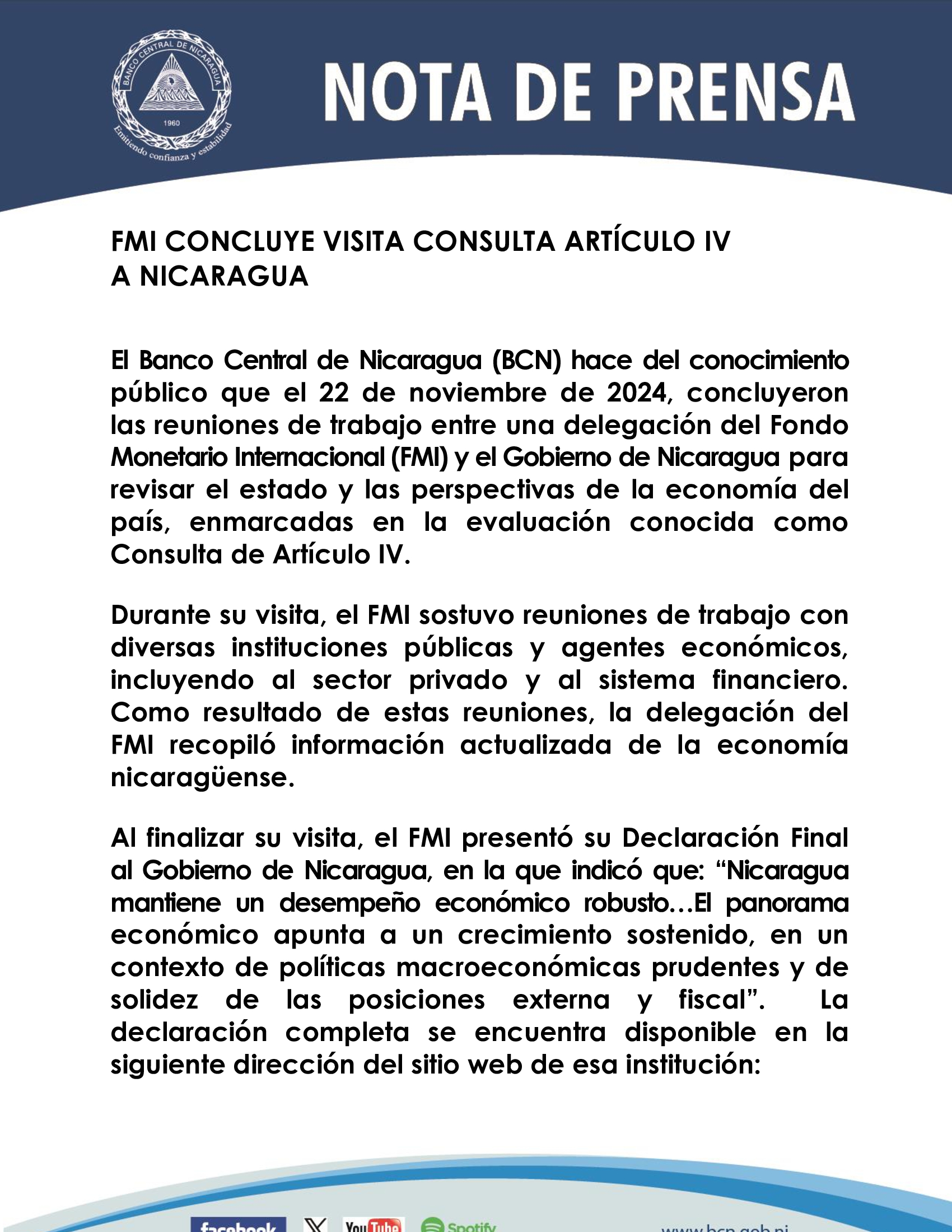 El Banco Central de Nicaragua (BCN) hace del conocimiento público que el 22 de noviembre de 2024, concluyeron las reuniones de trabajo entre una delegación del Fondo Monetario Internacional (FMI) y el Gobierno de Nicaragua para revisar el estado y las perspectivas de la economía del país, enmarcadas en la evaluación conocida como Consulta de Artículo IV.