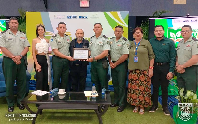 En cumplimiento a las órdenes del Comandante en Jefe del Ejército de Nicaragua, General de Ejército Julio César Avilés Castillo, de avanzar en la mejora continua del proceso educativo en la Universidad de Defensa de Nicaragua “4 de mayo” (UDENIC), el 30 de noviembre de 2024, en el auditorio “Fernando Gordillo Cervantes”, de la UNAN-Managua, recibió reconocimiento en la ceremonia de premiación del “Concurso Nacional de Universidades Verdes”, en el marco de la implementación de la Estrategia Nacional de Educación en todas sus modalidades “Bendiciones y Victorias” 2024-2026, organizado por el Consejo Nacional de Universidades (CNU).