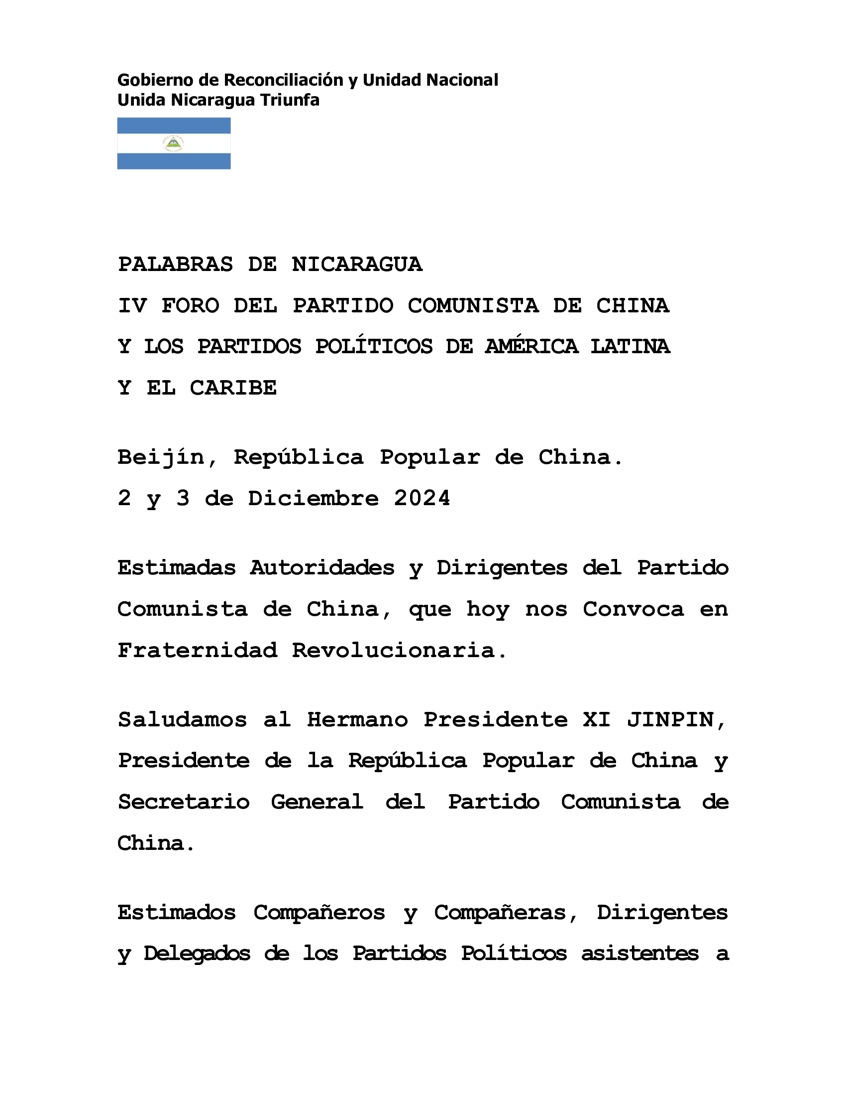 Asistimos desde nuestra Nicaragua Bendita y Siempre Libre, como Pueblo de Andrés Castro, Rubén Darío, del Patriota Insigne Benjamín Zeledón, del General de Hombres Libres A.C. Sandino, para trasmitir el abrazo fraterno del Comandante Daniel Ortega Saavedra, Presidente de Nuestra Bendita Nicaragua, y de la Compañera Rosario Murillo, Vice Presidenta de nuestra Amada Nicaragua. Ambos, Lideres del Pueblo, del Frente Sandinista de Liberación Nacional y de nuestro Gobierno Revolucionario.