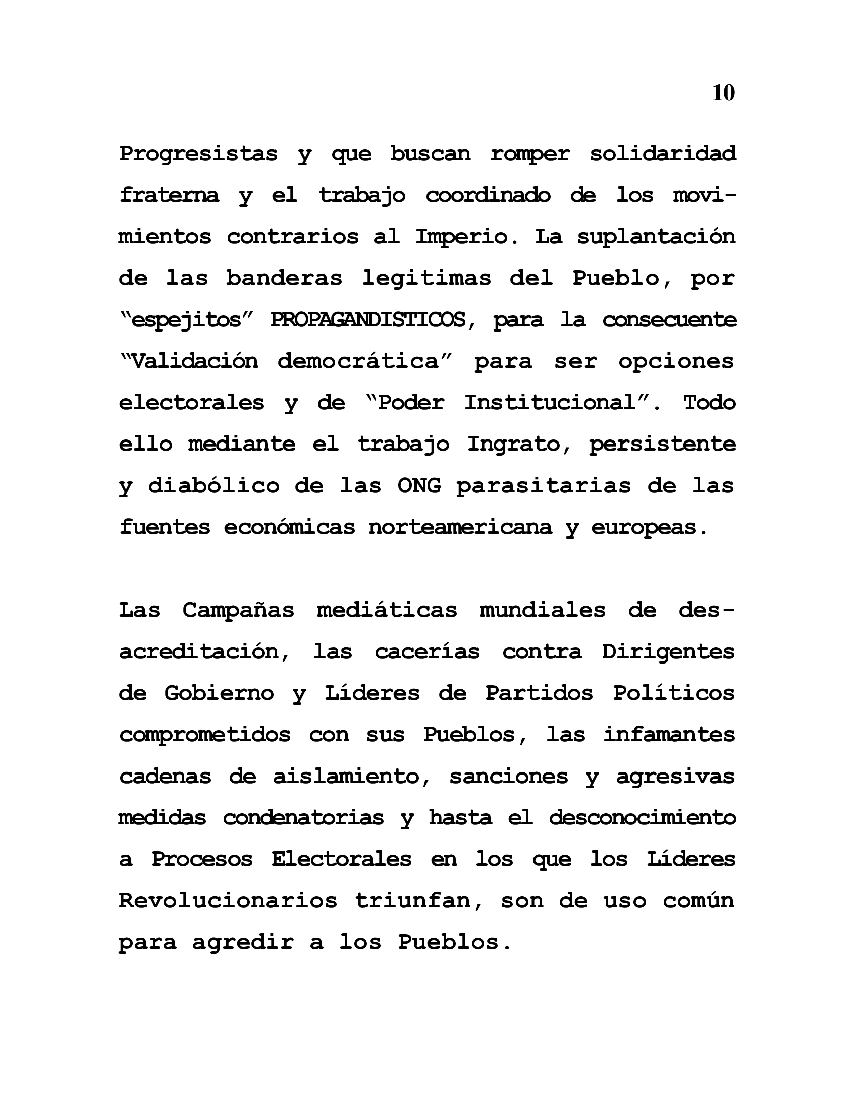 seeking to break fraternal solidarity and the coordinated work of movements against the Empire. The substitution of the legitimate flags of the people by PROPAGANDA "mirrors" for the consequent "democratic validation" to be electoral options and "Institutional Power". All this through the ungrateful, persistent and diabolical work of parasitic NGOs of North American and European economic sources.