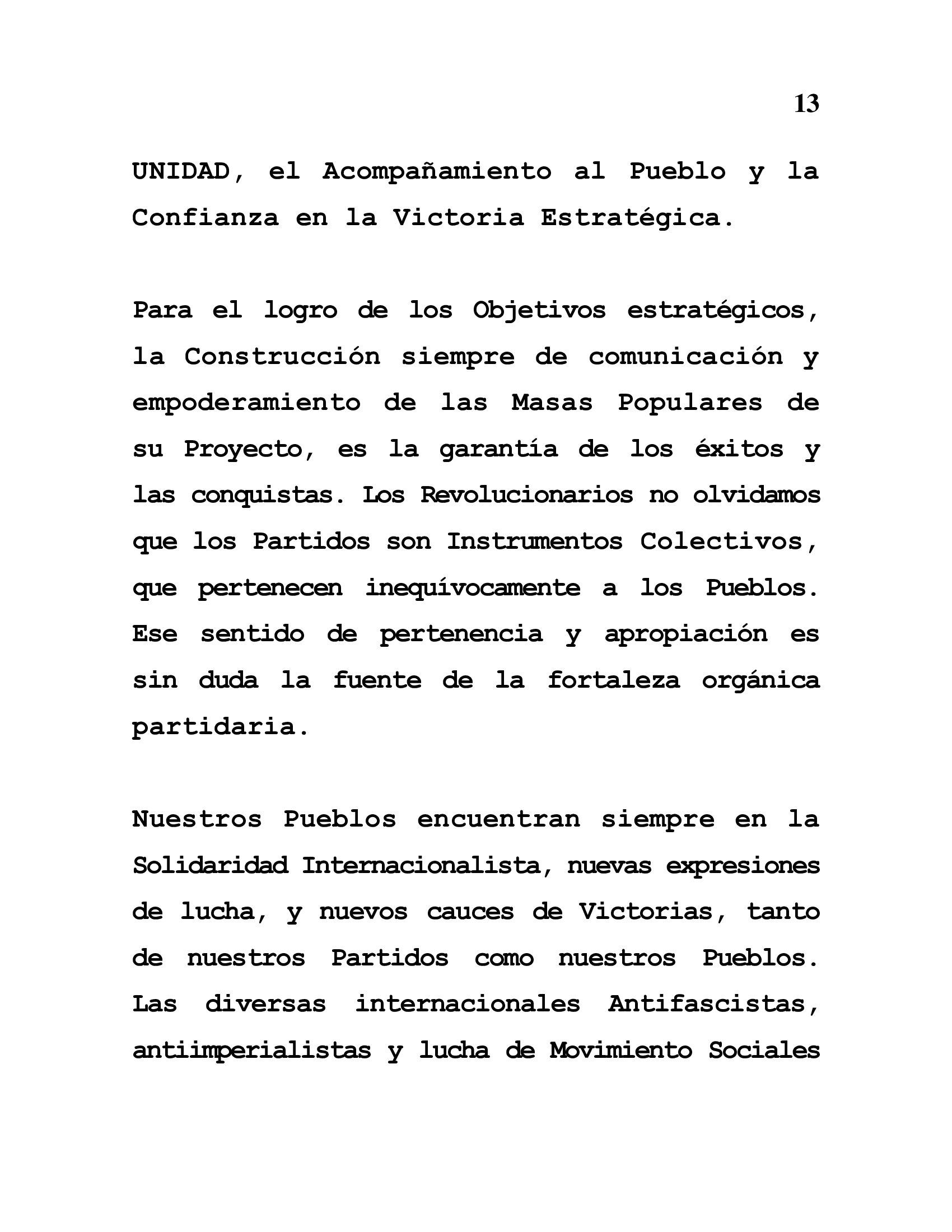 Nuestros Pueblos encuentran siempre en la Solidaridad Internacionalista, nuevas expresiones de lucha, y nuevos cauces de Victorias, tanto de nuestros Partidos como nuestros Pueblos. Las diversas internacionales Antifascistas, antiimperialistas y lucha de Movimiento Sociales se construyen con ejes muy comunes y articuladores. Los Principios de Dignidad. Patriotismo, Soberanías, Autodeterminación e Independencia alimentan infinitamente las Convicciones de Libertad y Paz en las que debemos vivir los Pueblos de esta Tierra.