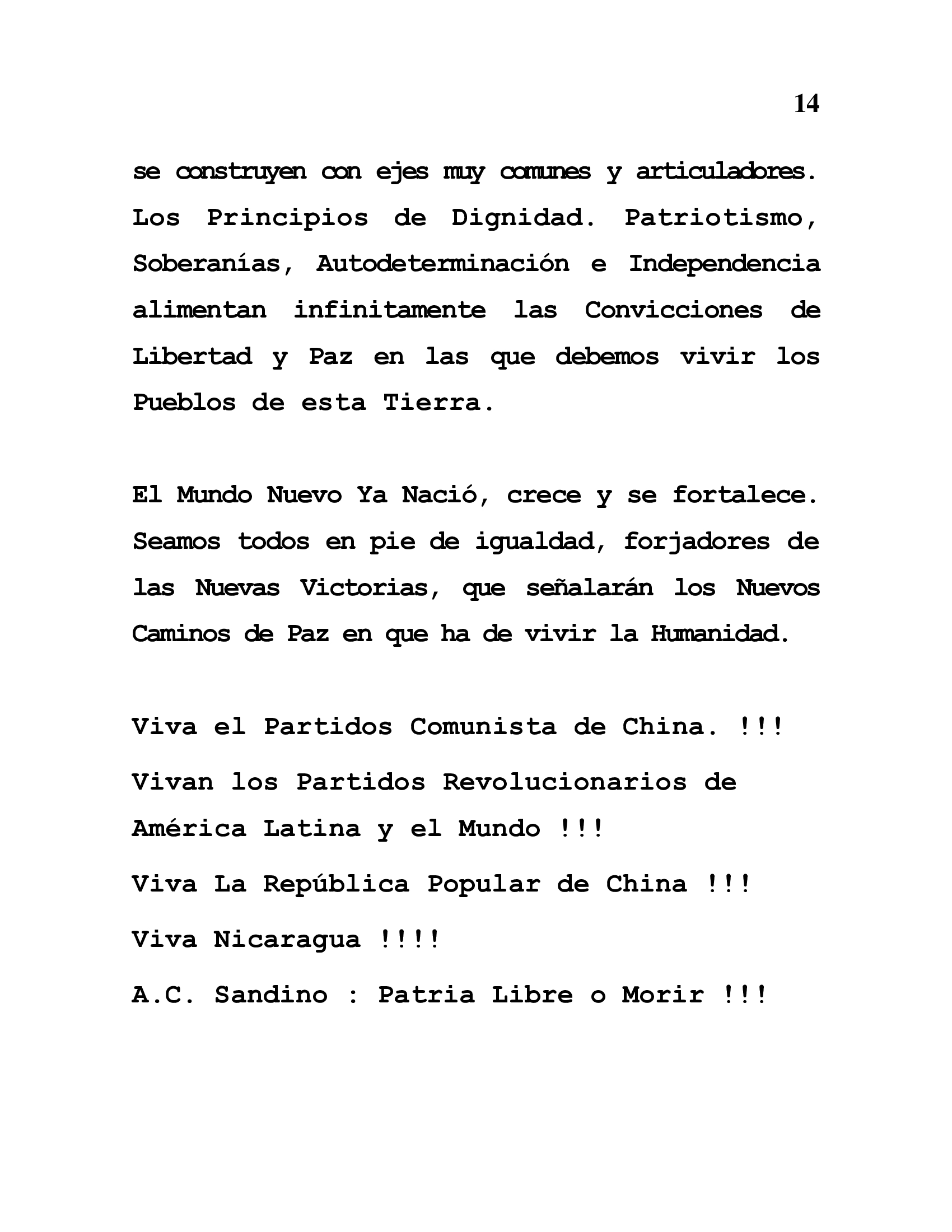 A estos esfuerzos Pacificadores de China, Nicaragua y otros pueblos Libres, así como Partidos y Organizaciones revolucionarias, nos hemos adheridos con mucha prontitud y oportunidad, pues compartimos la Búsqueda de la paz, como condición esencial de la Vida en Plena Libertad.