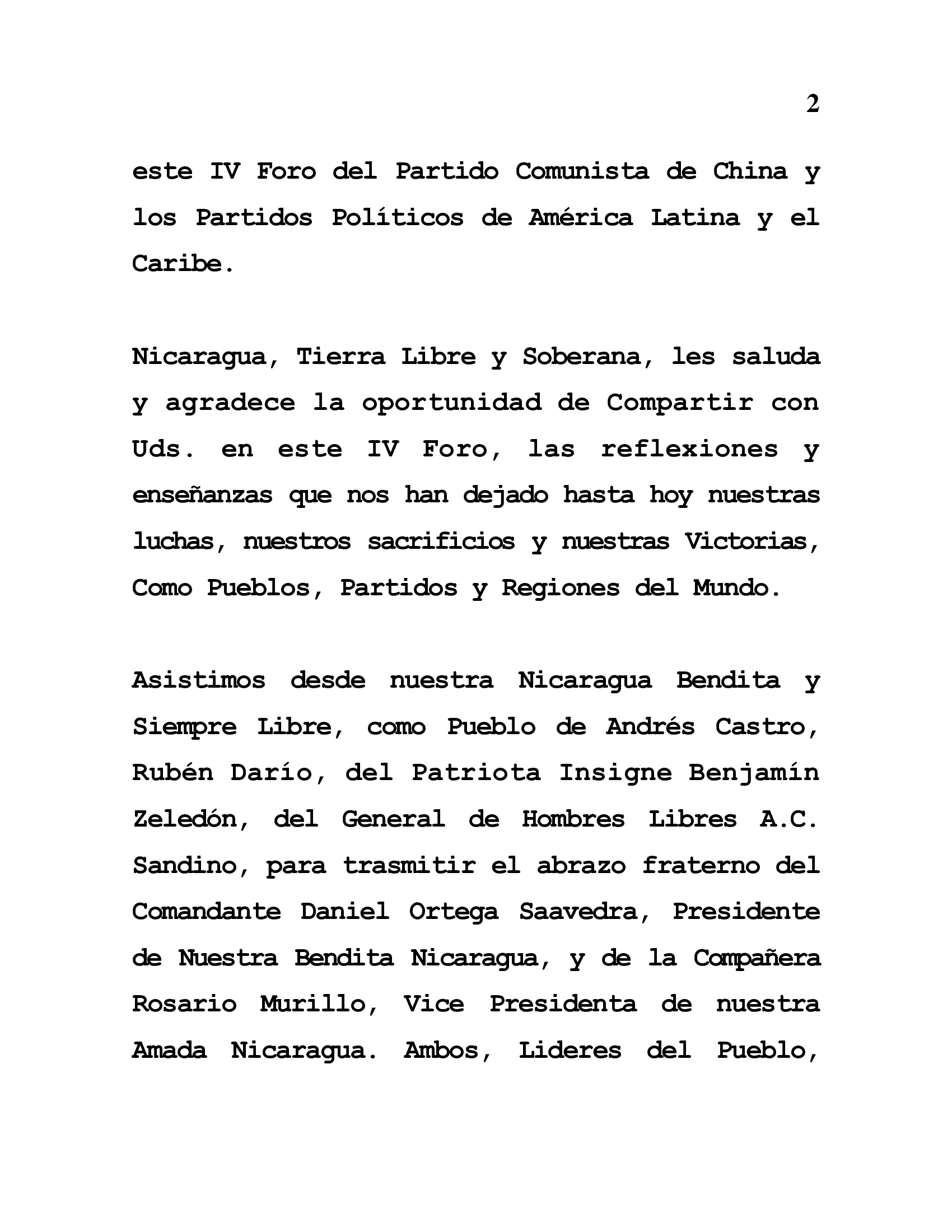 Nicaragua, Tierra Libre y Soberana, les saluda y agradece la oportunidad de Compartir con Uds. en este IV Foro, las reflexiones y enseñanzas que nos han dejado hasta hoy nuestras luchas, nuestros sacrificios y nuestras Victorias, Como Pueblos, Partidos y Regiones del Mundo.