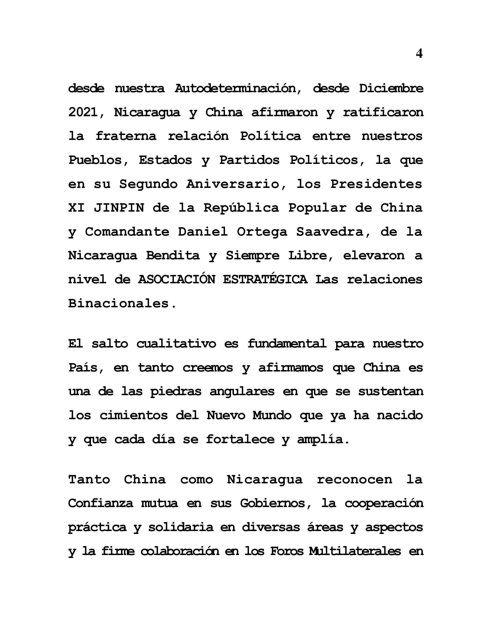 Within this framework, as a consequence of exercising our political sovereignty and full freedom from our self-determination, since December 2021, Nicaragua and China affirmed and ratified the fraternal political relations between our peoples, states and political parties, which on its second anniversary, Presidents Xi Jinping of the People's Republic of China and Comandante Daniel Ortega Saavedra, President of our Blessed and Always Free Nicaragua, elevated the binational relations to the level of STRATEGIC ASSOCIATION.