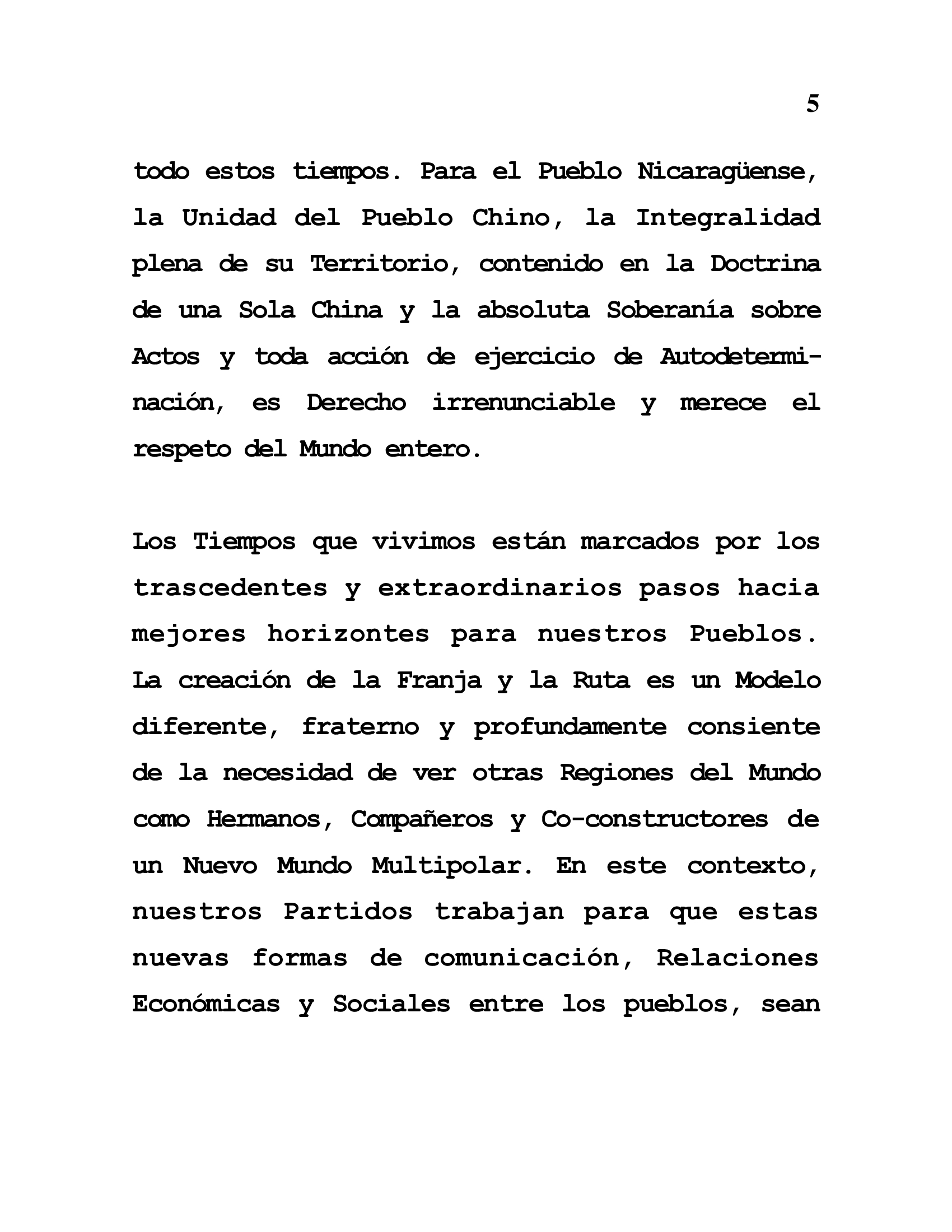 Tanto China como Nicaragua reconocen la Confianza mutua en sus Gobiernos, la cooperación práctica y solidaria en diversas áreas y aspectos y la firme colaboración en los Foros Multilaterales en todo estos tiempos. Para el Pueblo Nicaragüense, la Unidad del Pueblo Chino, la Integralidad plena de su Territorio, contenido en la Doctrina de una Sola China y la absoluta Soberanía sobre Actos y toda acción de ejercicio de Autodetermi-nación, es Derecho irrenunciable y merece el respeto del Mundo entero.