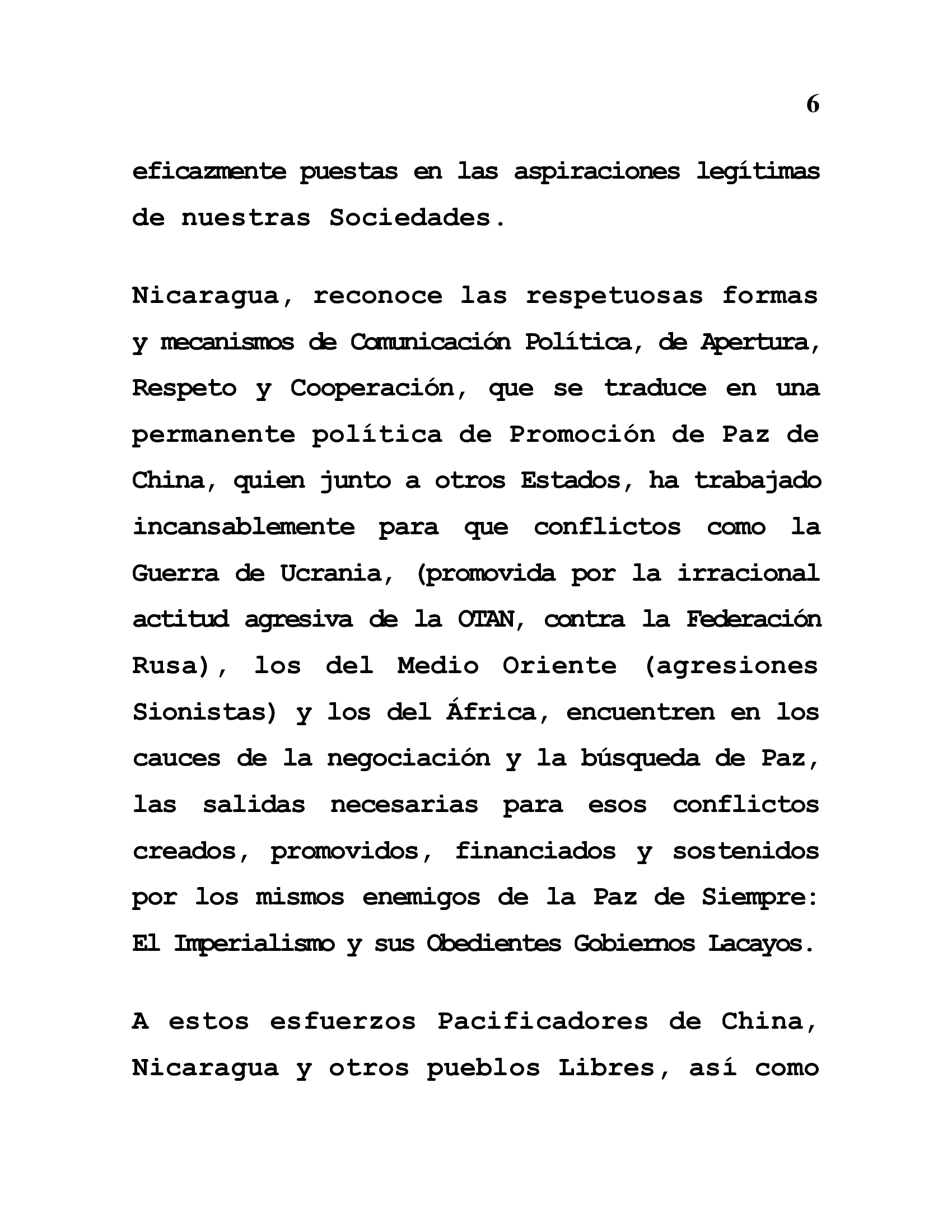 Nicaragua recognizes the respectful forms and mechanisms of Political Communication, openness, respect and cooperation, which translates into a permanent policy of Peace Promotion by China who, together with other States, has worked tirelessly so that conflicts such as the War in Ukraine (promoted by the irrational aggressive attitude of NATO against the Russian Federation), those in the Middle East (Zionist aggressions), and those in Africa, can find in the channels of negotiation and the search for Peace the necessary solutions for these conflicts, which are created, promoted, financed and sustained by the same enemies of Peace as Always: Imperialism and its Obedient Lackey Governments.