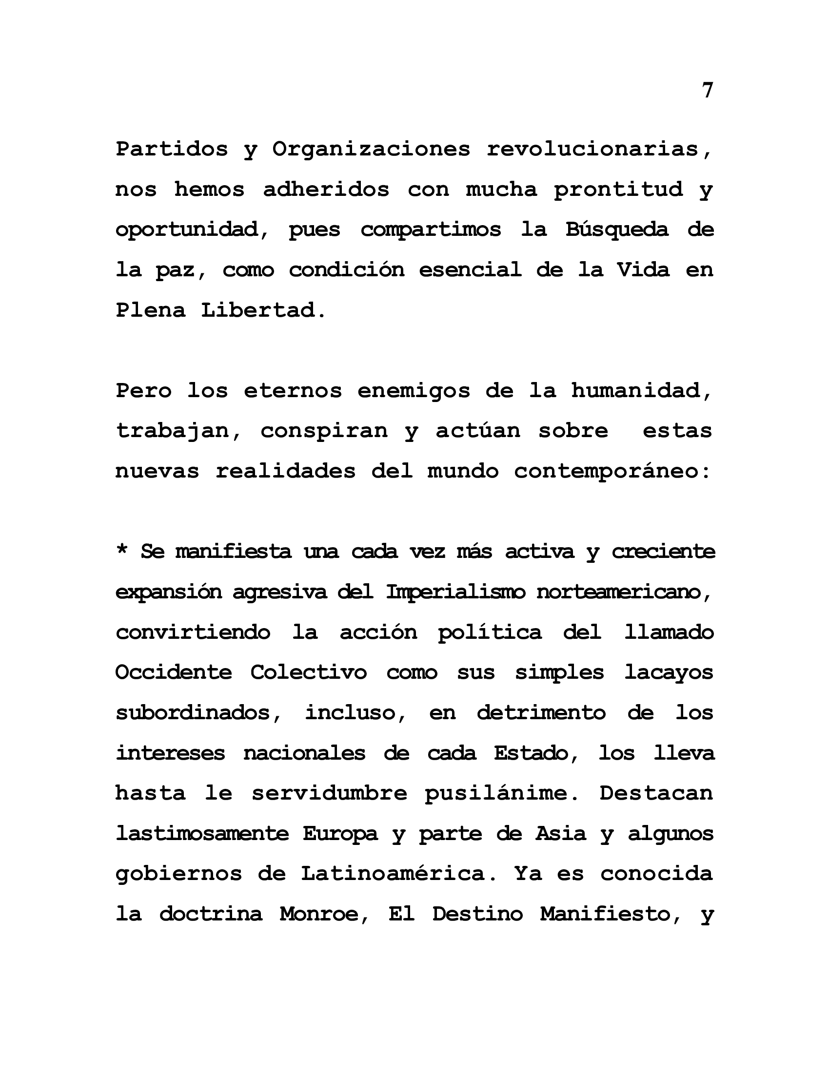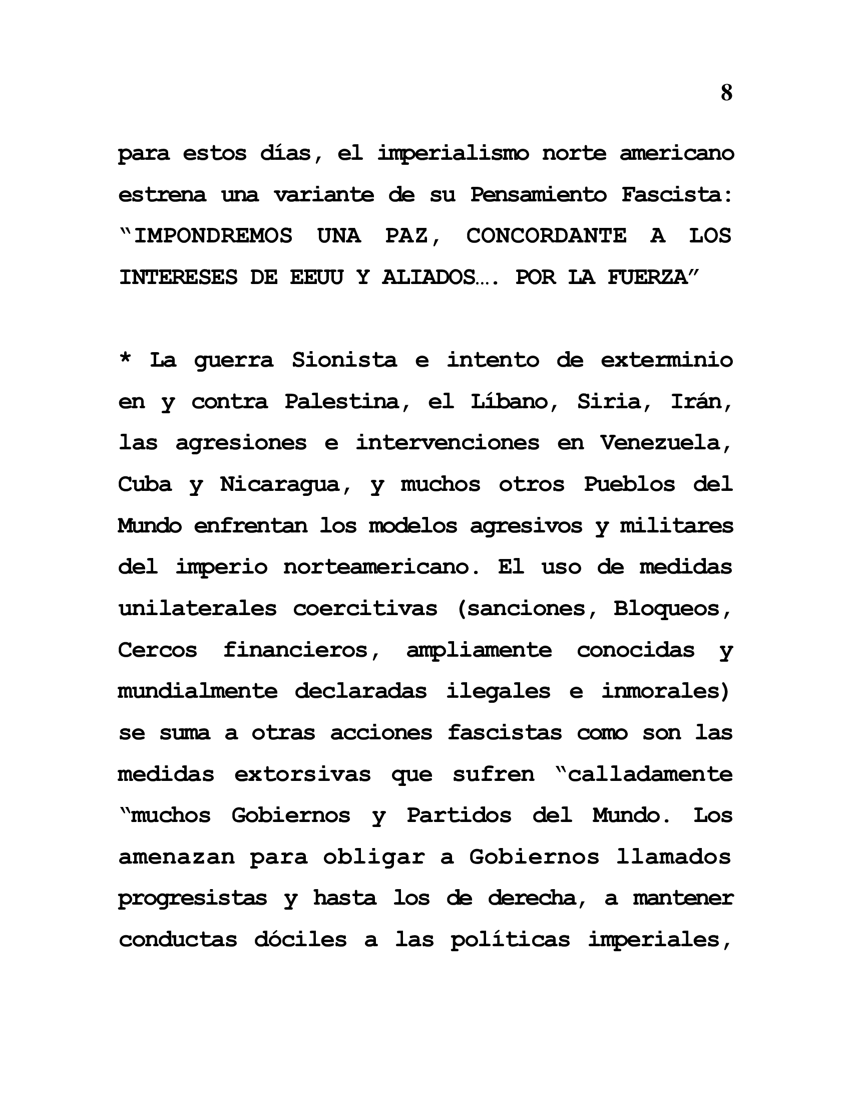 * The Zionist war and attempted extermination in and against Palestine, Lebanon, Syria and Iran; the aggressions and interventions in Venezuela, Cuba and Nicaragua, and many other peoples of the world are confronted by the aggressive and military models of the North American empire. The use of unilateral coercive measures (sanctions, blockades, financial walls, widely known and declared illegal and immoral worldwide) is added to other fascist actions such as the extortionate measures that many governments and parties of the world suffer "quietly". They threaten so-called progressive governments and even those of the right, as well as "collaborators and enthusiastic" condemners of revolutionary governments and not docile to the empire, to maintain docile behaviors to imperial policies. They show off in forums, circuses and any other political trick set up for such purposes.