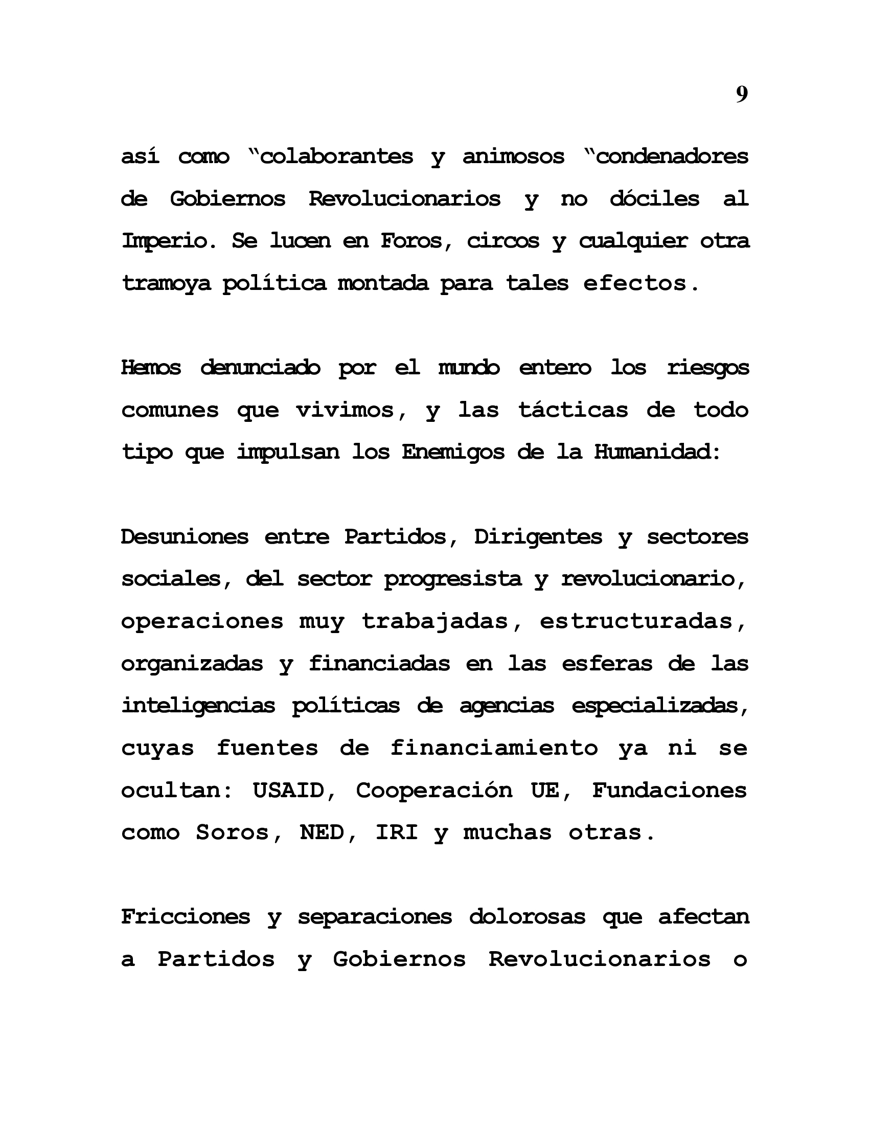 Fricciones y separaciones dolorosas que afectan a Partidos y Gobiernos Revolucionarios o Progresistas y que buscan romper solidaridad fraterna y el trabajo coordinado de los movi-mientos contrarios al Imperio. La suplantación de las banderas legitimas del Pueblo, por “espejitos” PROPAGANDISTICOS, para la consecuente “Validación democrática” para ser opciones electorales y de “Poder Institucional”. Todo ello mediante el trabajo Ingrato, persistente y diabólico de las ONG parasitarias de las fuentes económicas norteamericana y europeas.